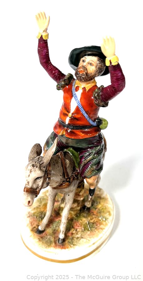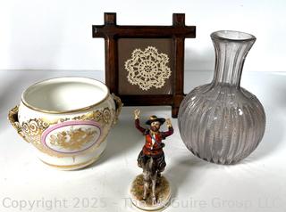 Lot #0234CP: Sancho Panza Statuette, Gilt Rimmed Bowl, Glass Crystal Vase and Framed Crewel Doily