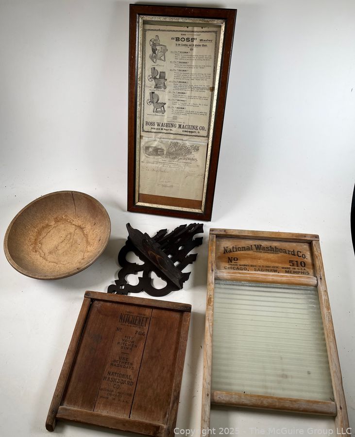 Lot #1374RM: Washboards, Framed Washing Machine Information, Bowl Etc