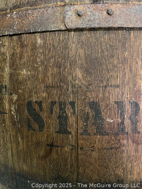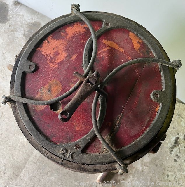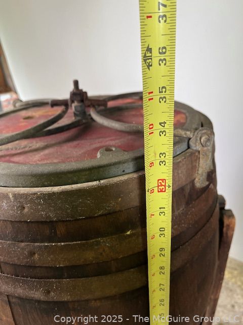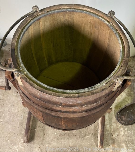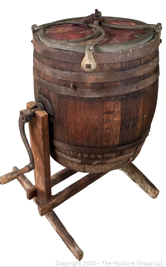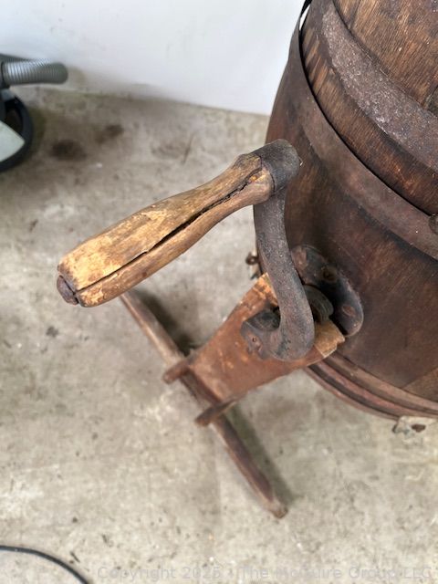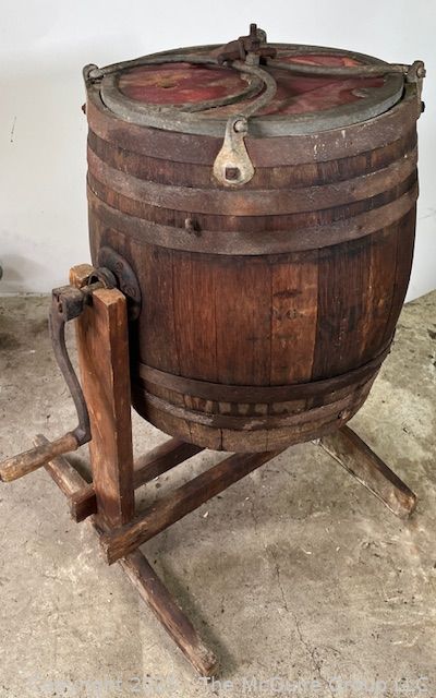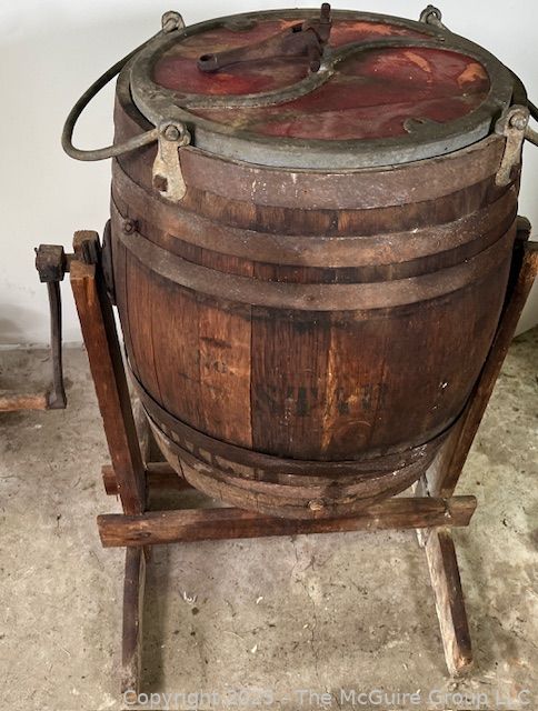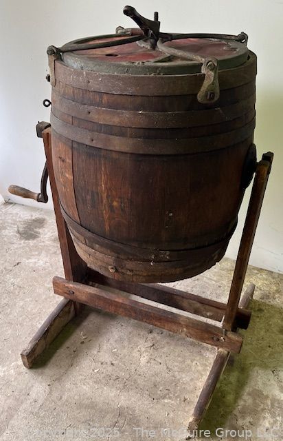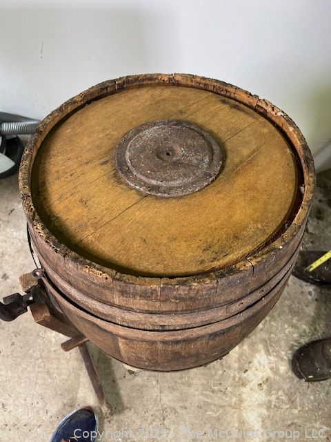 Lot #0151RM: Antique Hand Crank Oak and Iron Banding Butter Churn Barrel on Stand. Measures 16W x 34"T