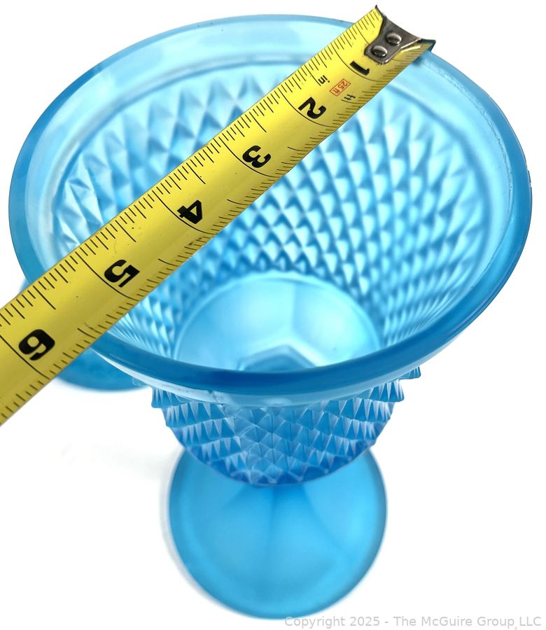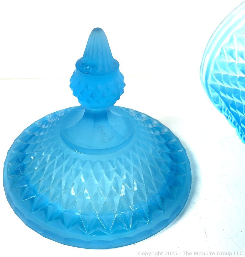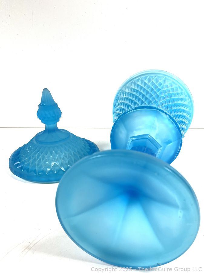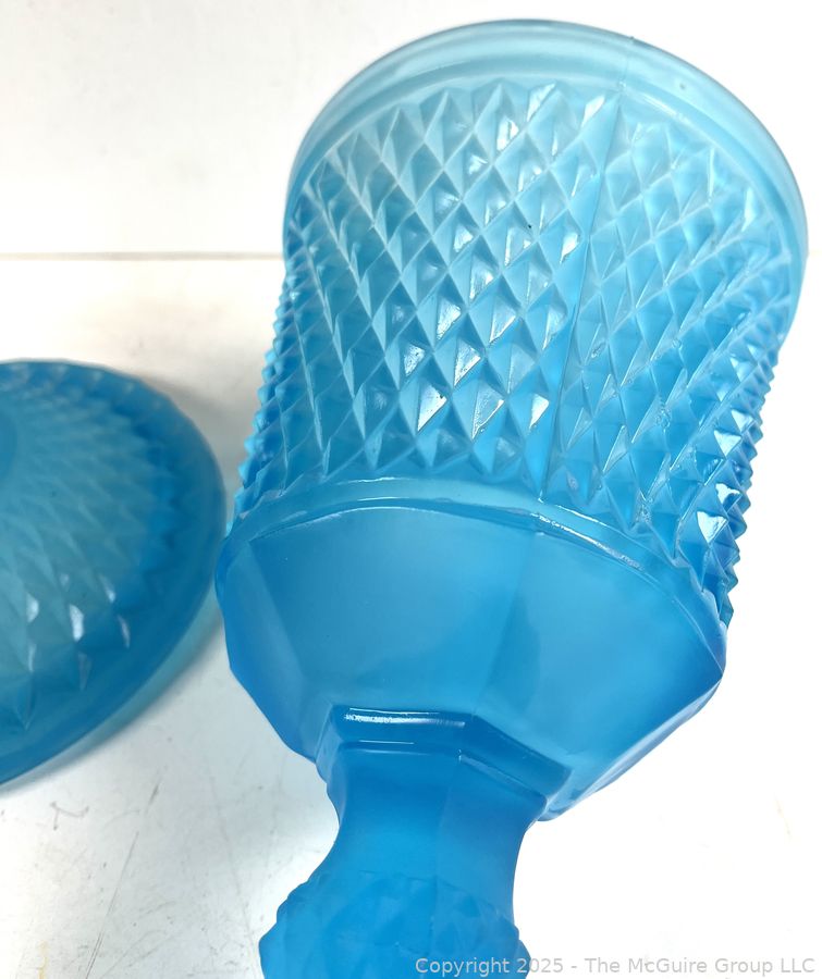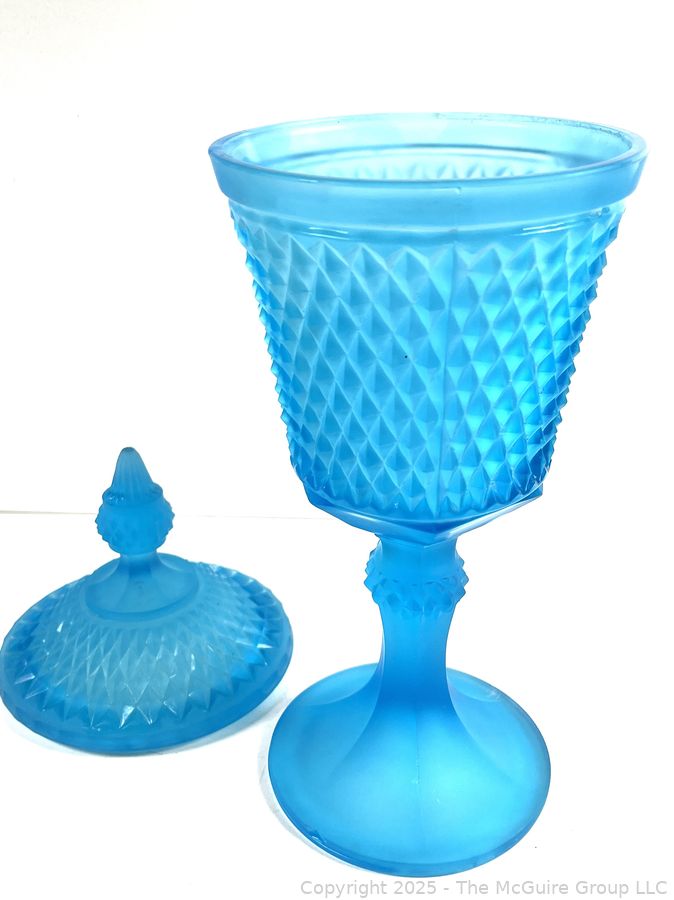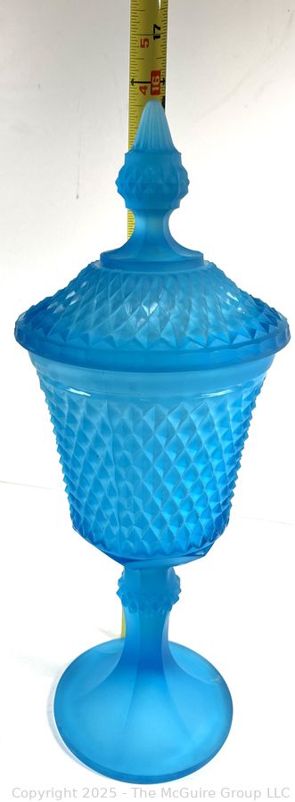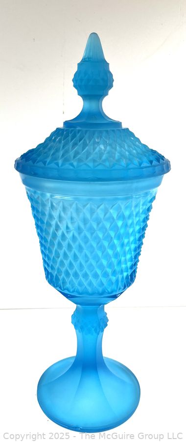 Lot #0381RM: Blue Frosted Diamond Point Glass Apothecary Jar by Indiana Glass. 16"T