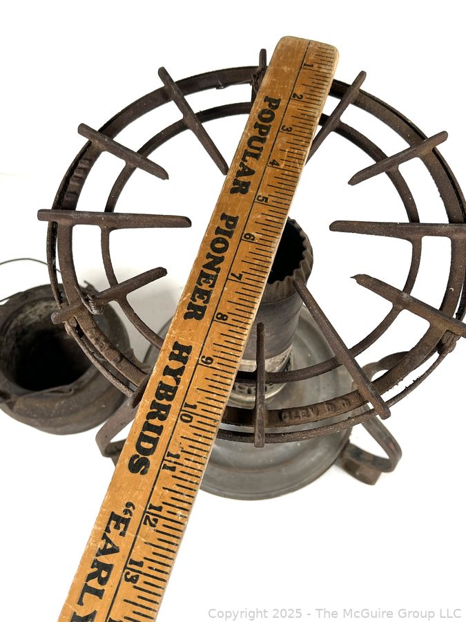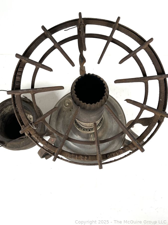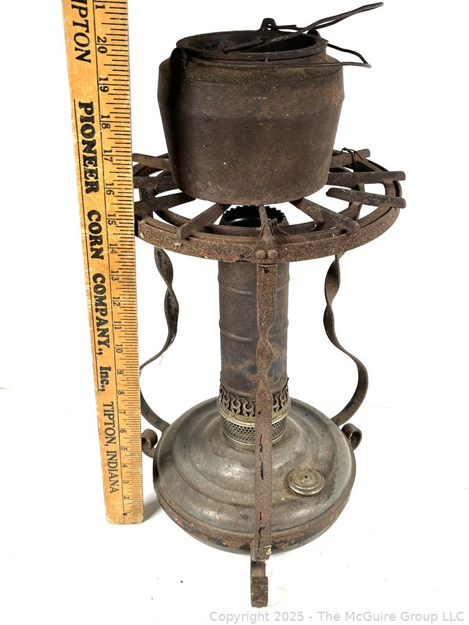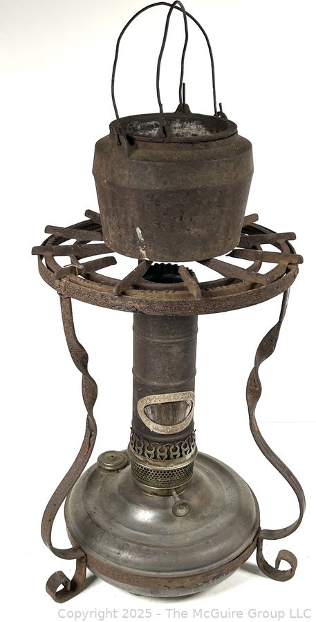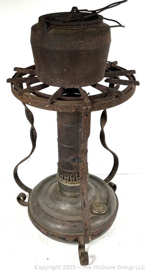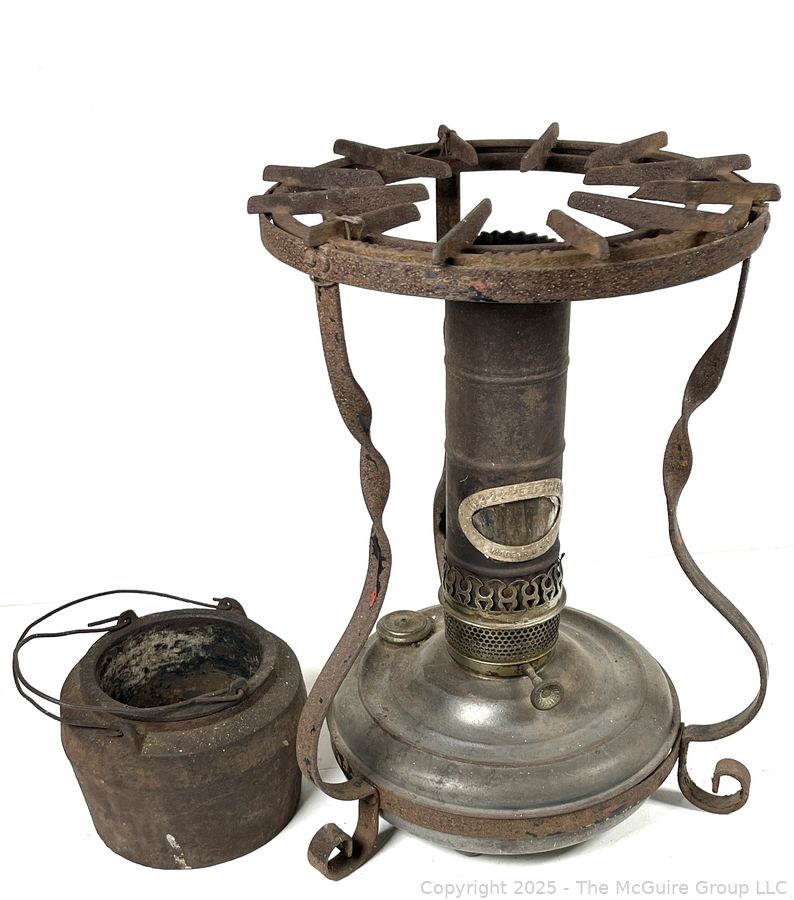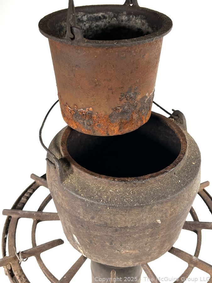 Lot #0581RM: Paired Lead Melting Smelting Cast Iron Pot & Gas Burner Stand for Blacksmith or Plumber