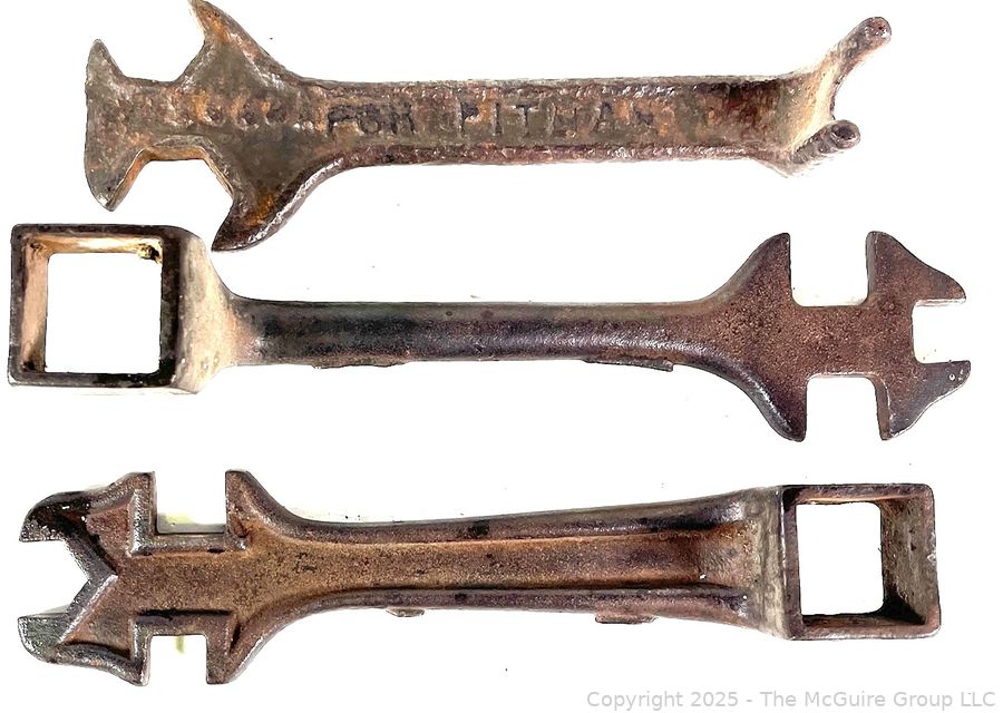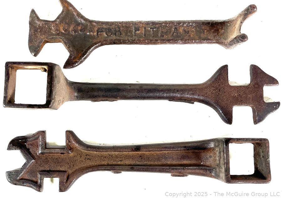Lot #0143RM: Three (3) Antique Cast Iron Fixed-Jaw Wrenches for Carriages/Buggies and Farm Implements. Includes Pitman and Others