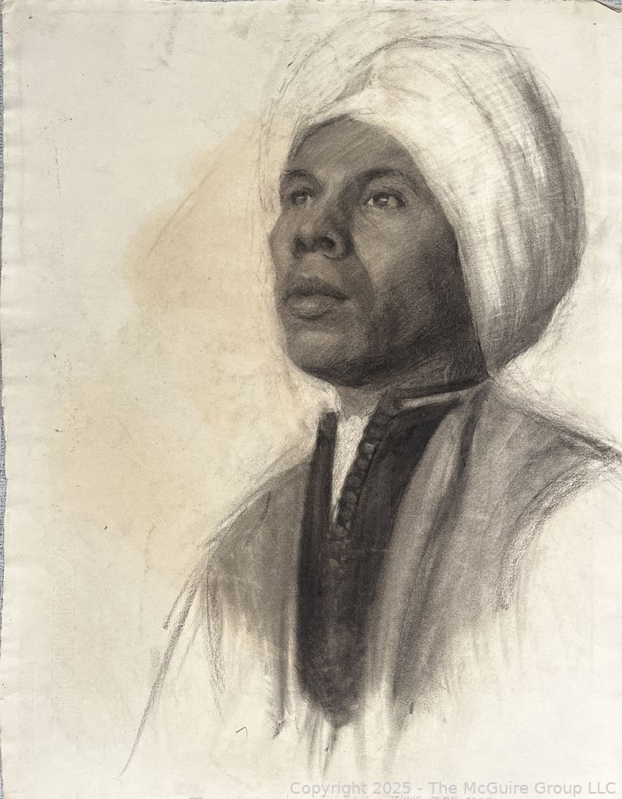 Lot #0034RM: Unframed Charcoal On Paper Titled, "Male Sitter In Cultural Attire" Signed Jennie Mae McGuire. February 1915 (WAS 723)