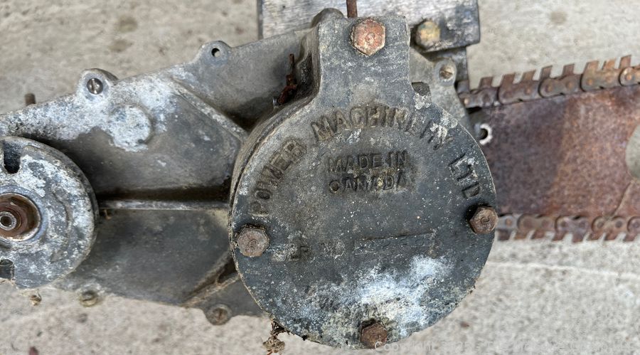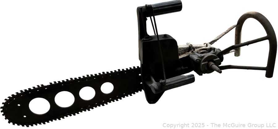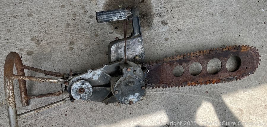 Lot #0088RM: Universal A Vintage Chain Saw Made by Power Machinery Ltd. w/ Rare "Lightening Holes" in Bar