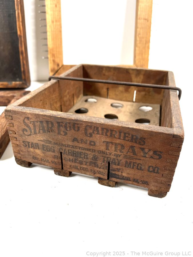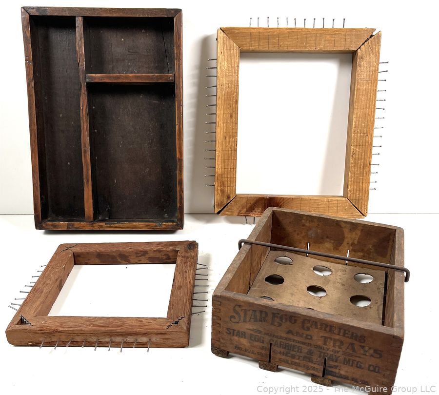 Lot #0286RM: Wooden Weaving Frames, School Supply Tray and Egg Carrying Crate