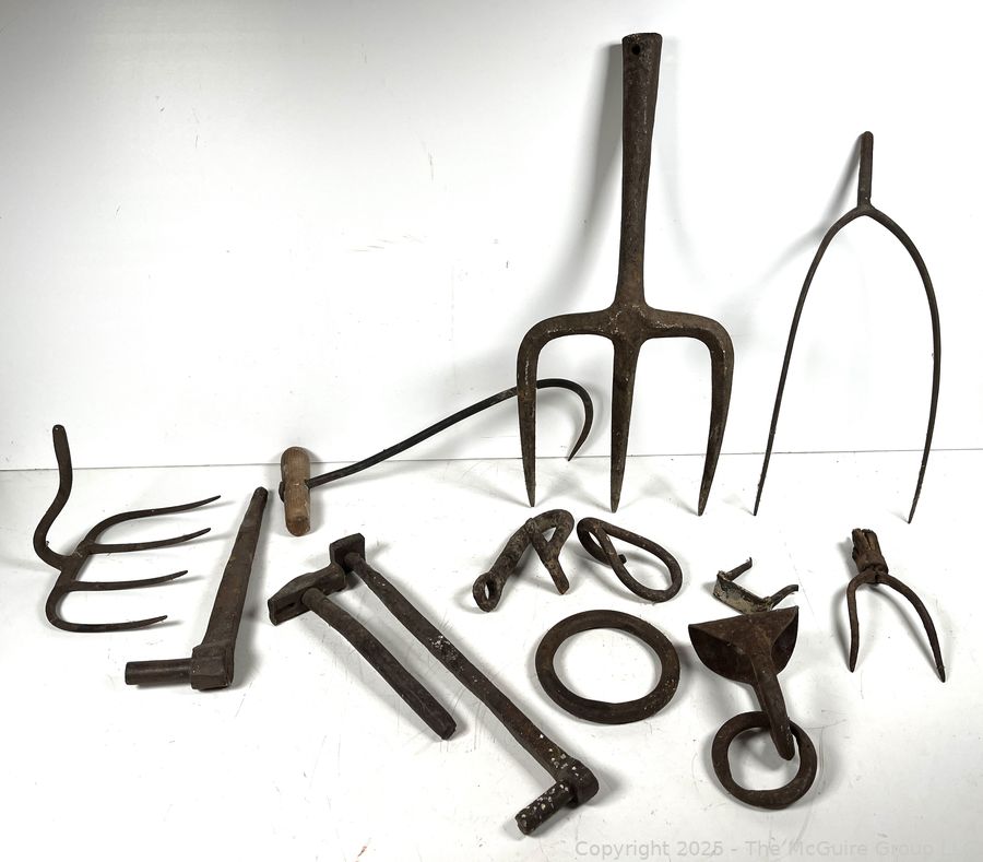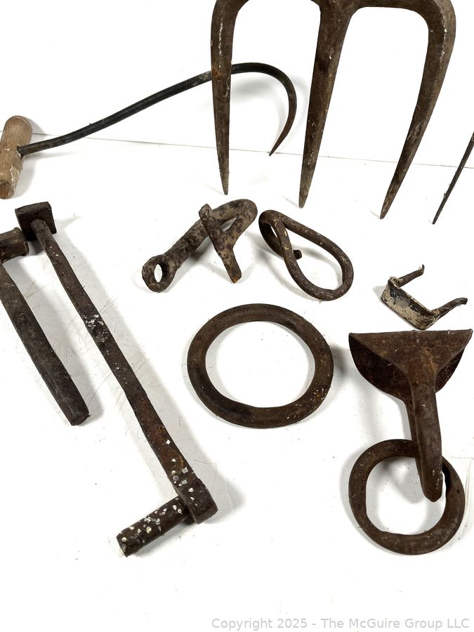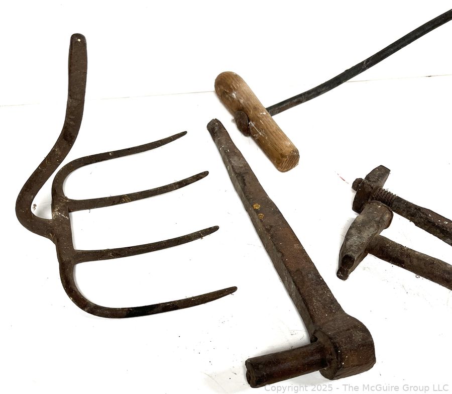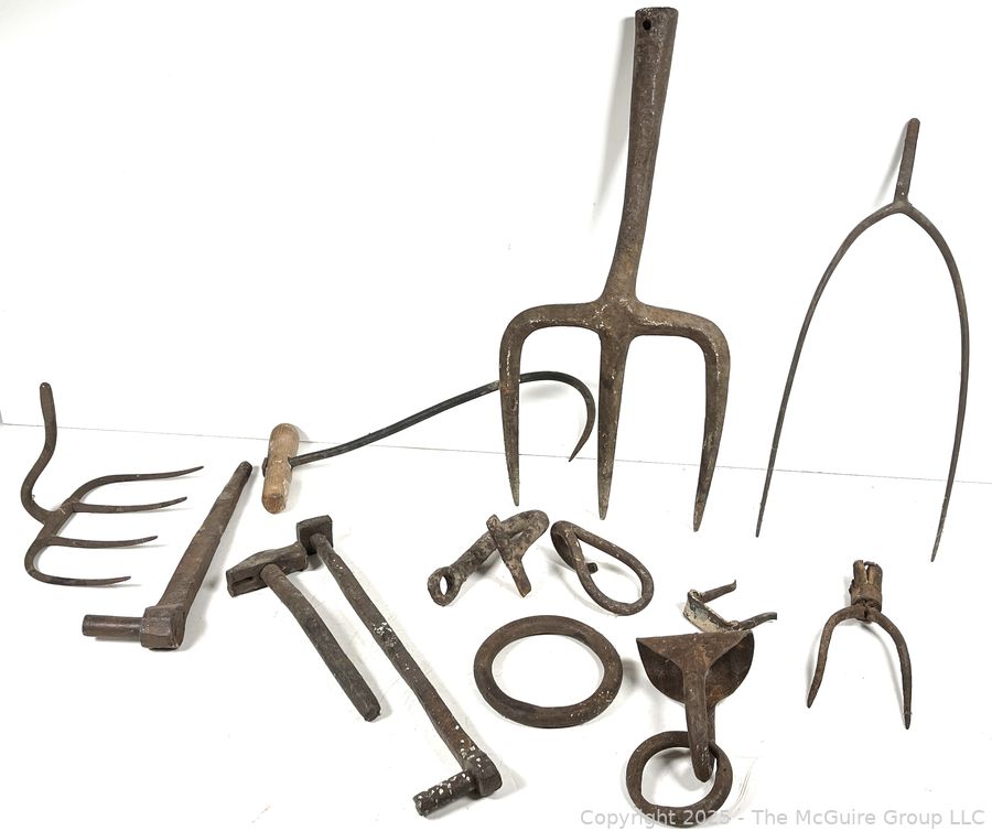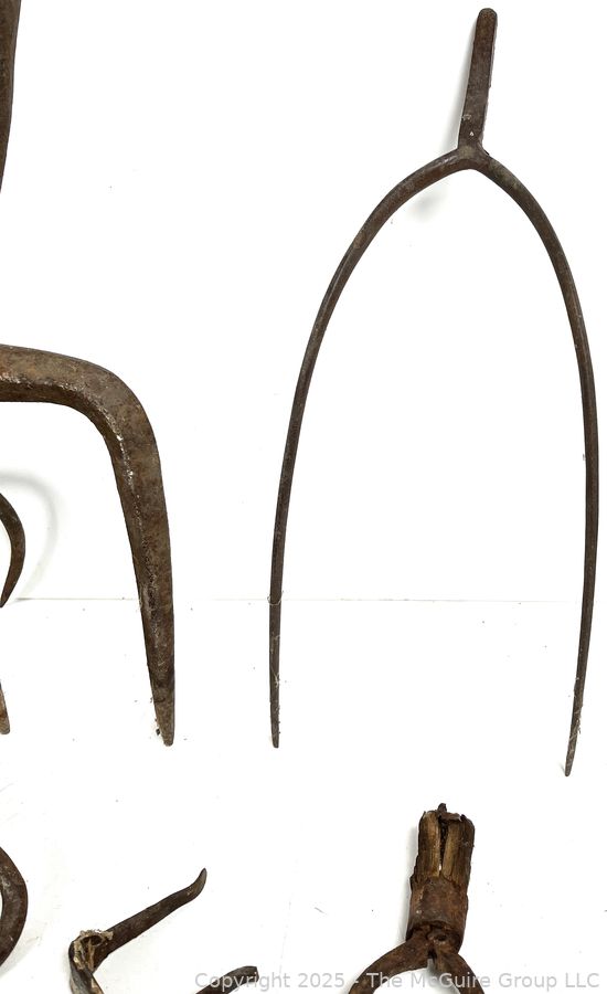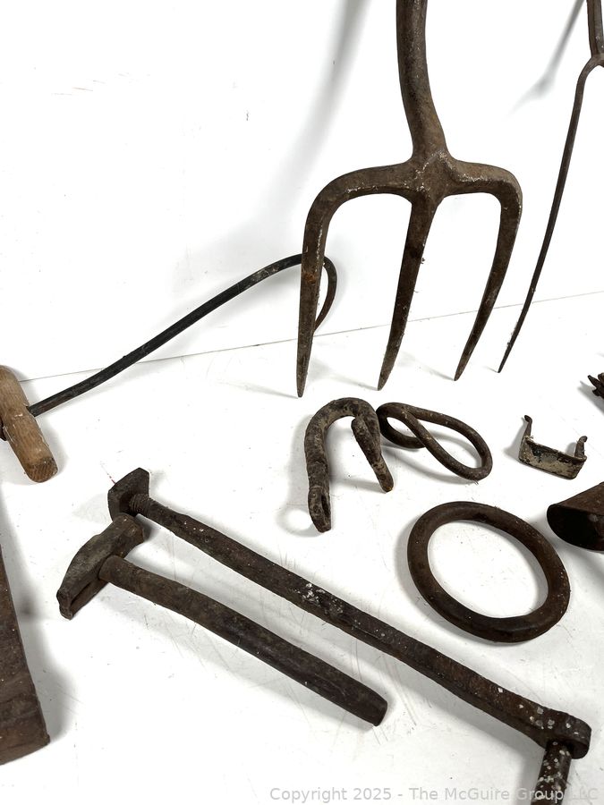 Lot #0601RM: 19th C Hand Forged Iron Farm Tools and Rake Heads