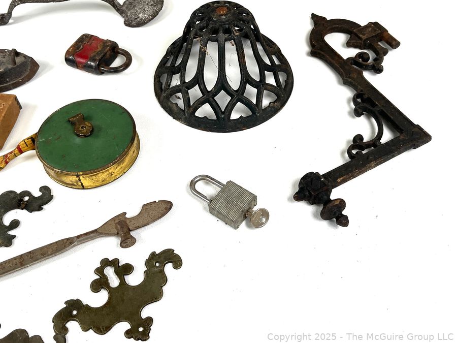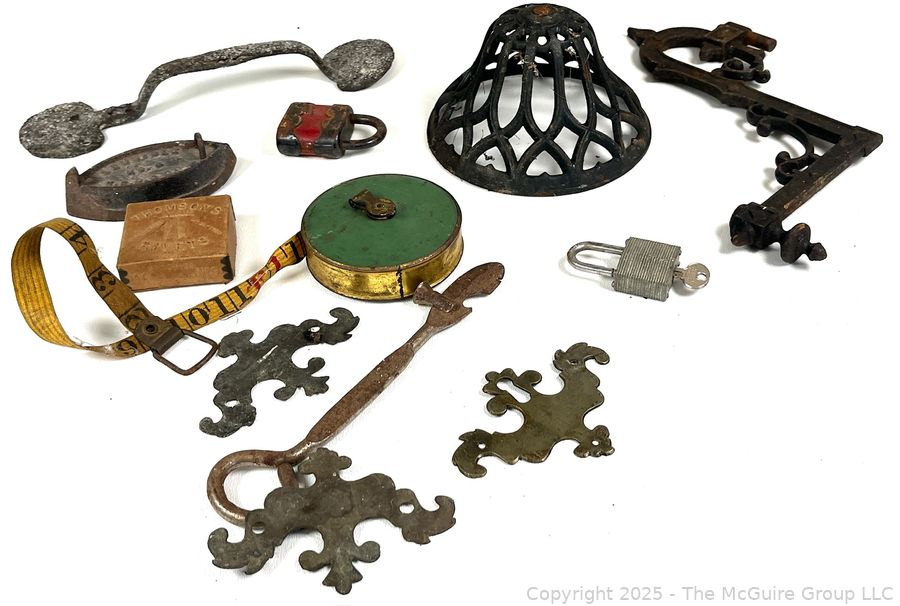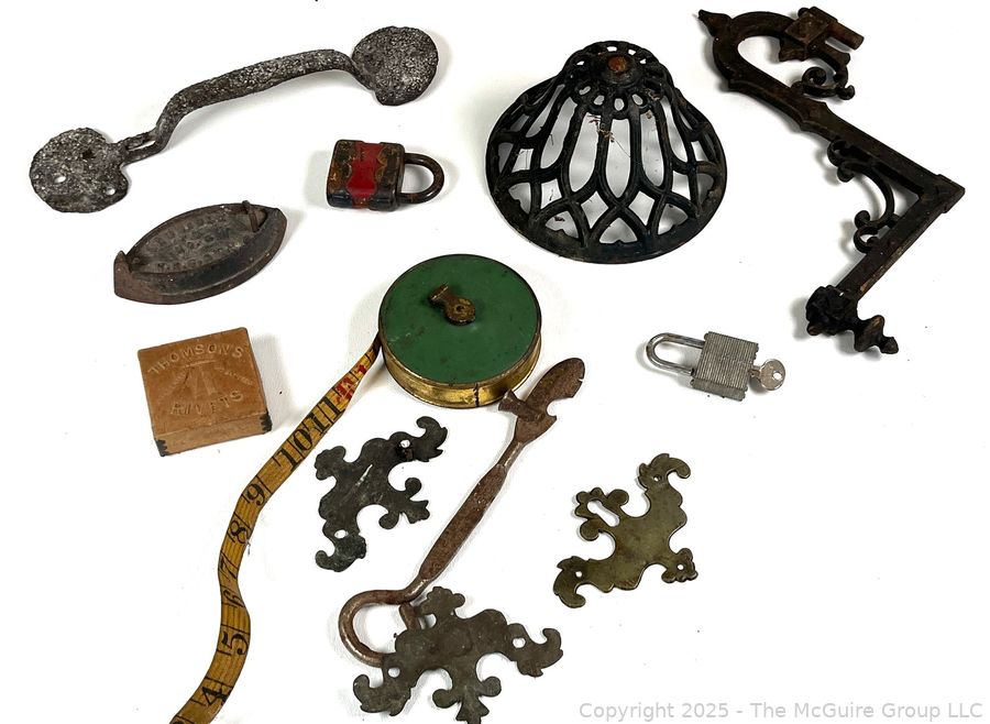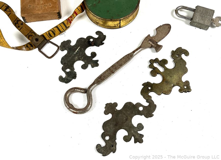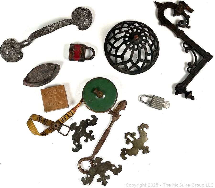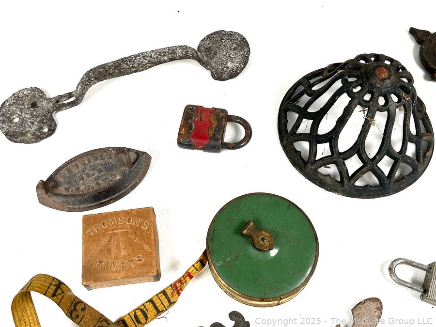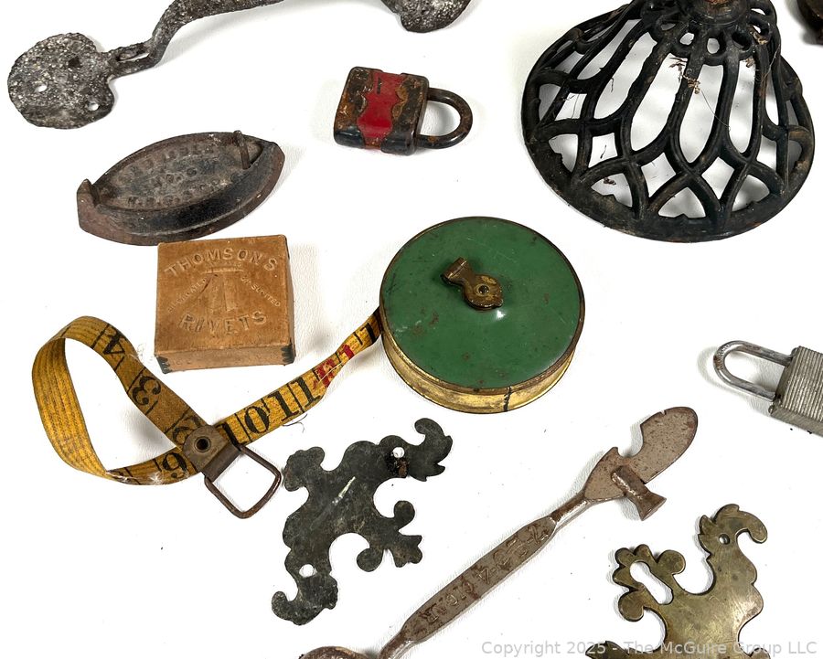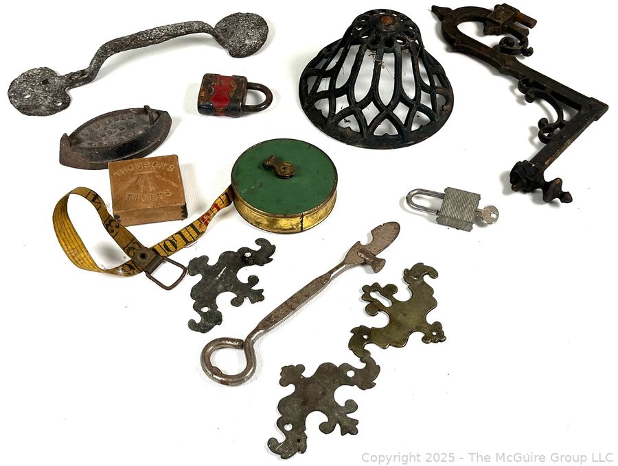 Lot #5108RM: Eclectic Grouping Including Brass Hardware, Padlocks and Cloth Tape Measure