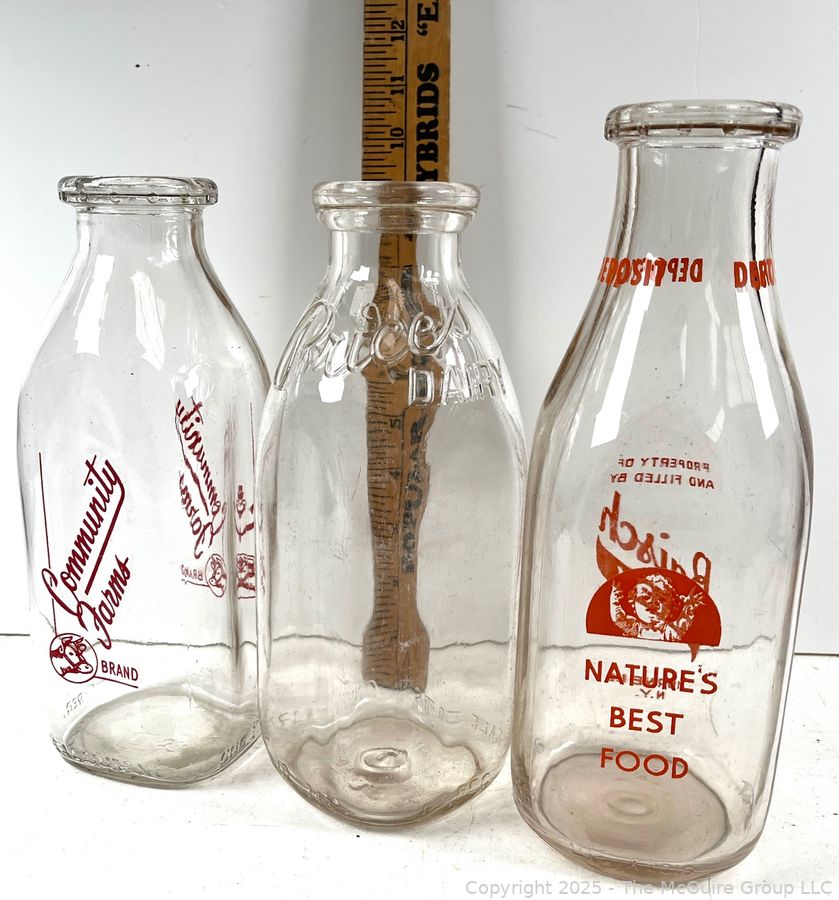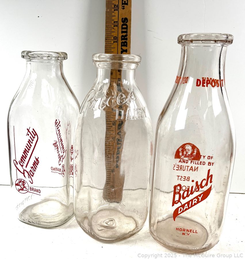 Lot #0946RM: Group of Three (3) Glass Milk Bottles Including Community and Baisch