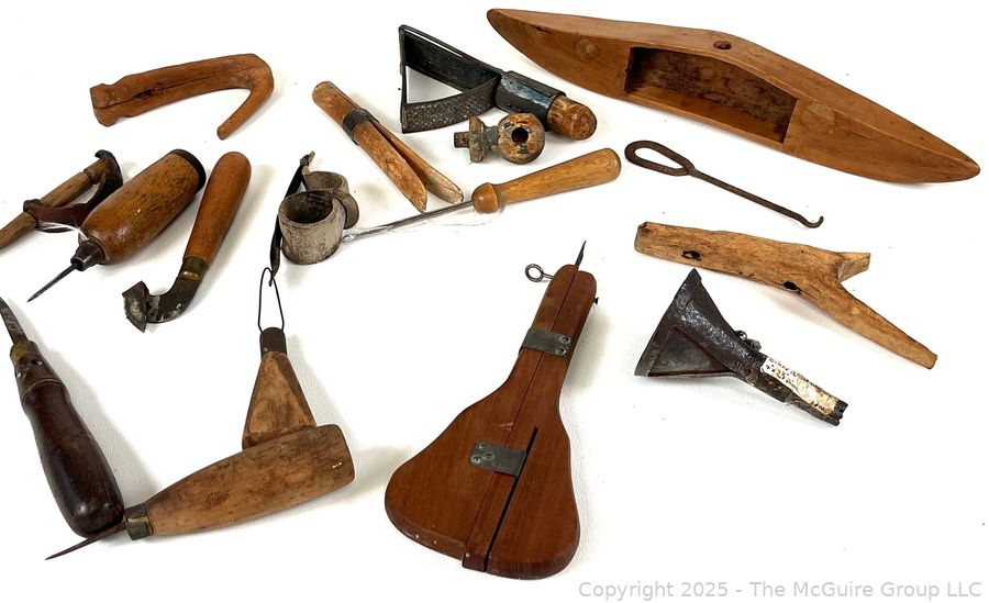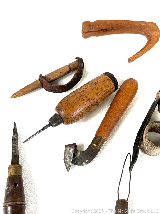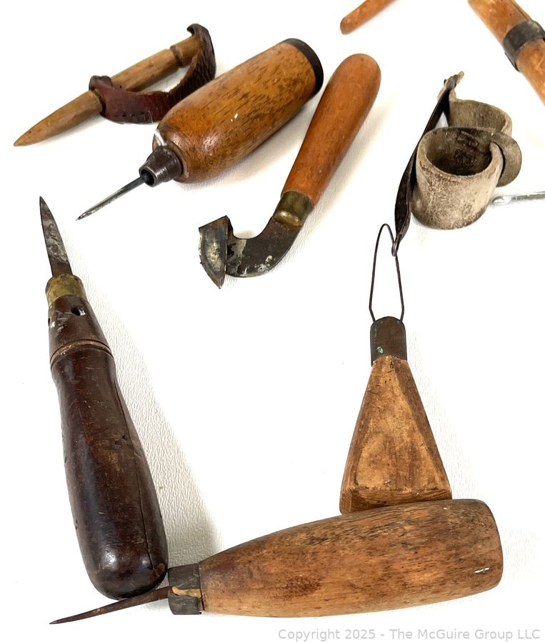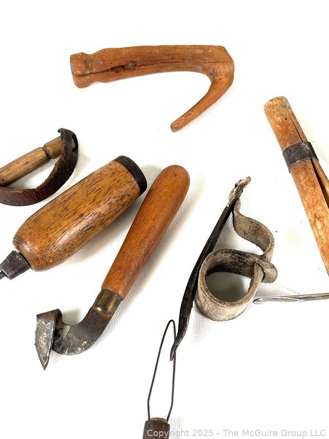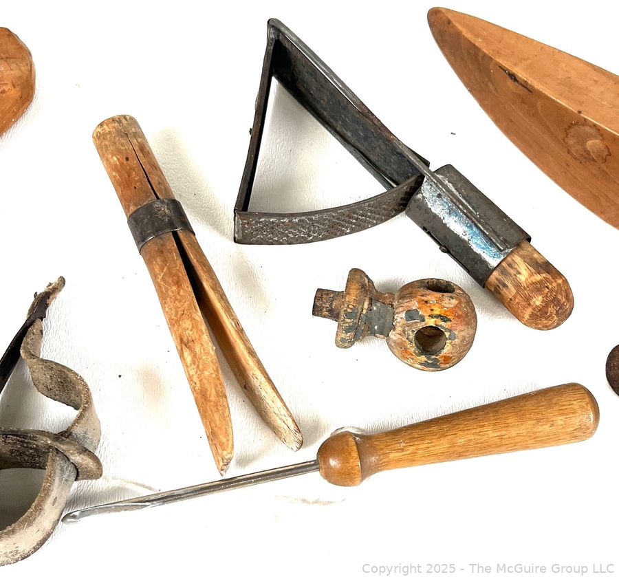 Lot #1433RM: Grouping of Traditional Hand Tools Used by Cobblers and Wheelwrights Tradesmen Including Hand Forged Iron Spoke Trimmer