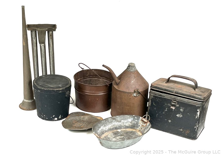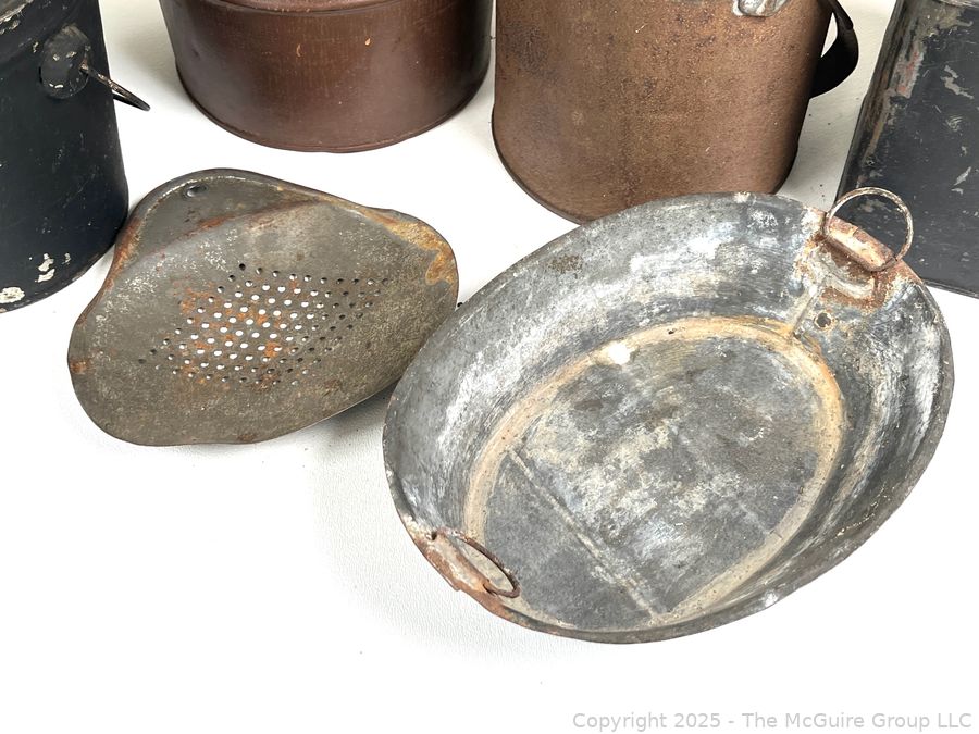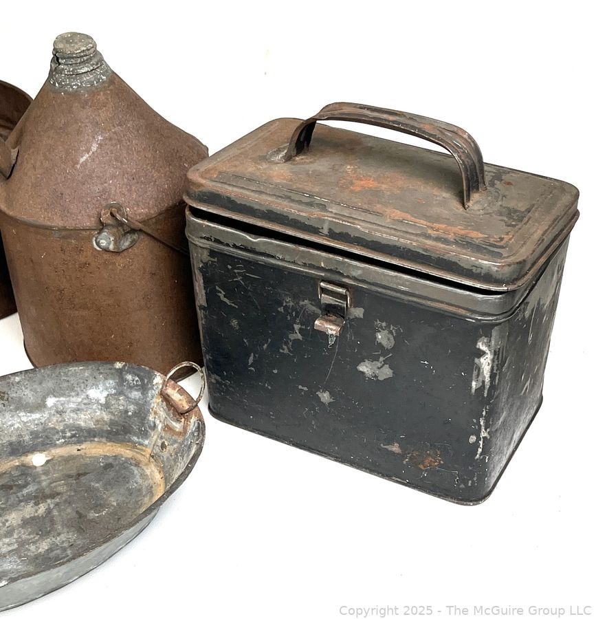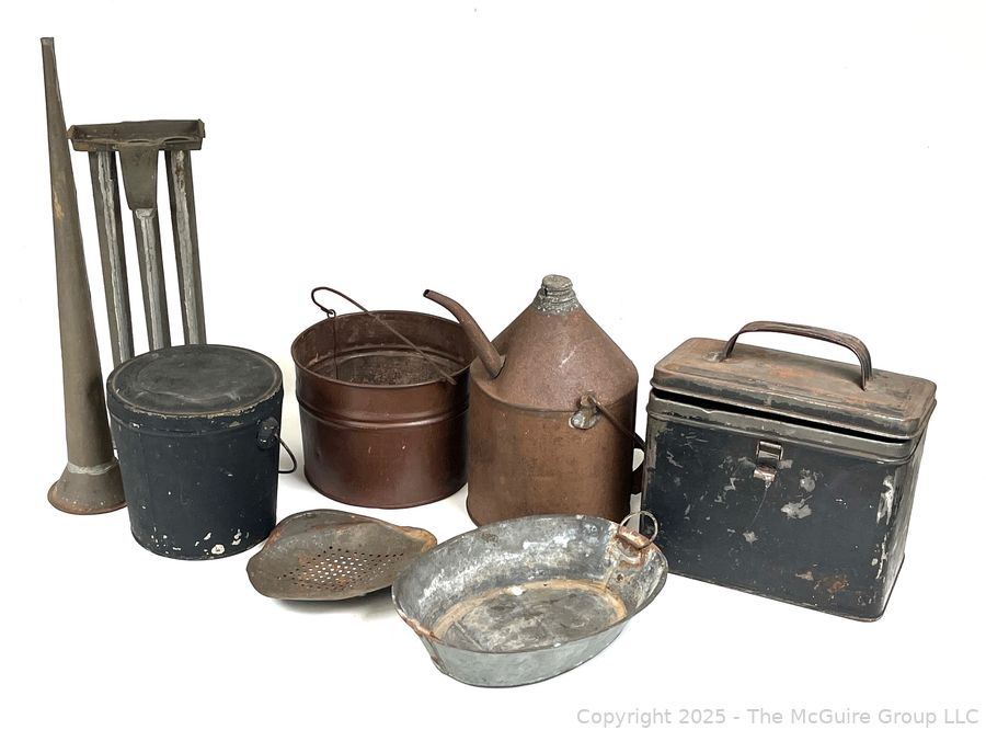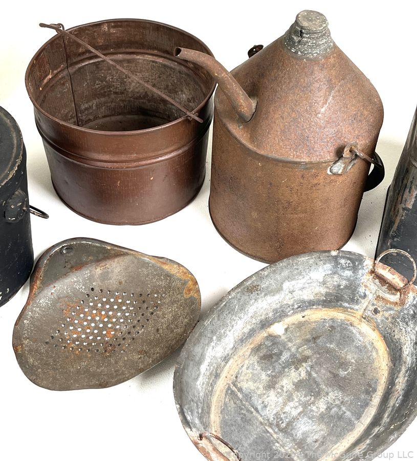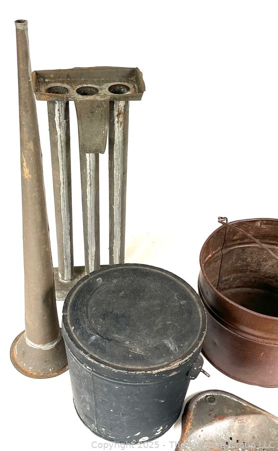 Lot #5116RM: Metalware Including Horn, Candle Mold, Pails, Oil Can and Lunch Box
