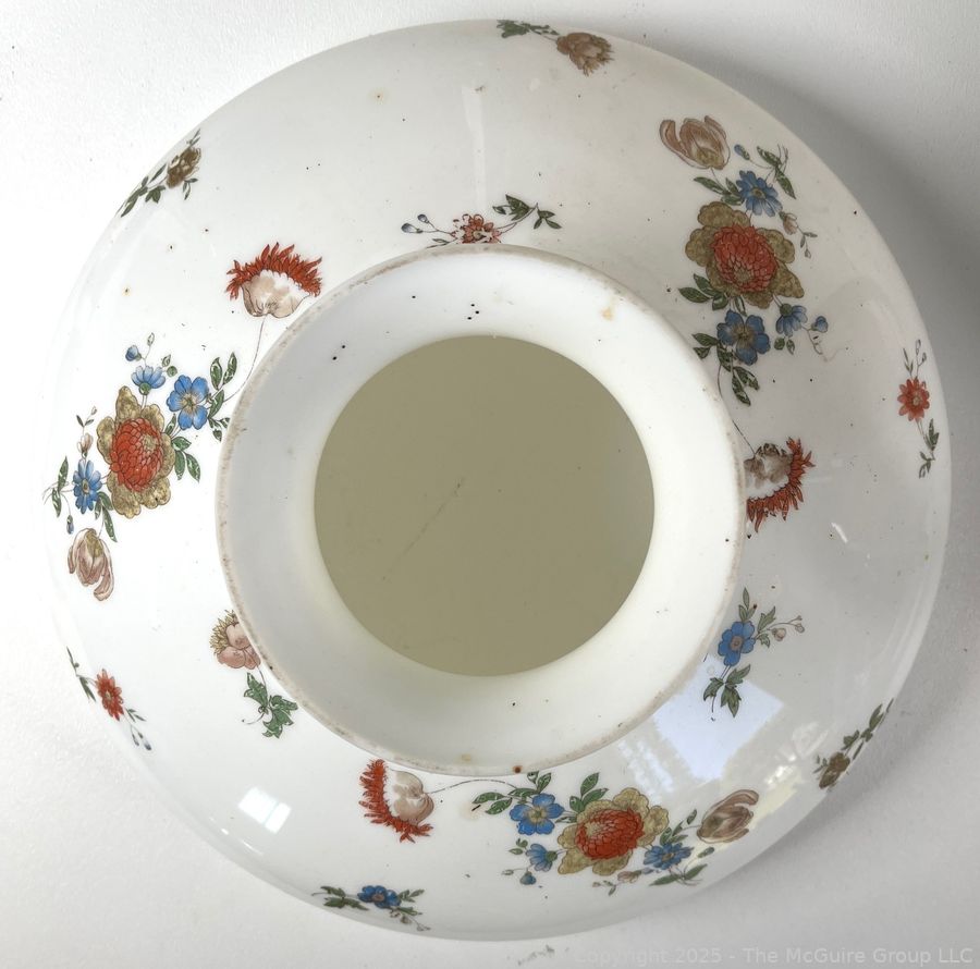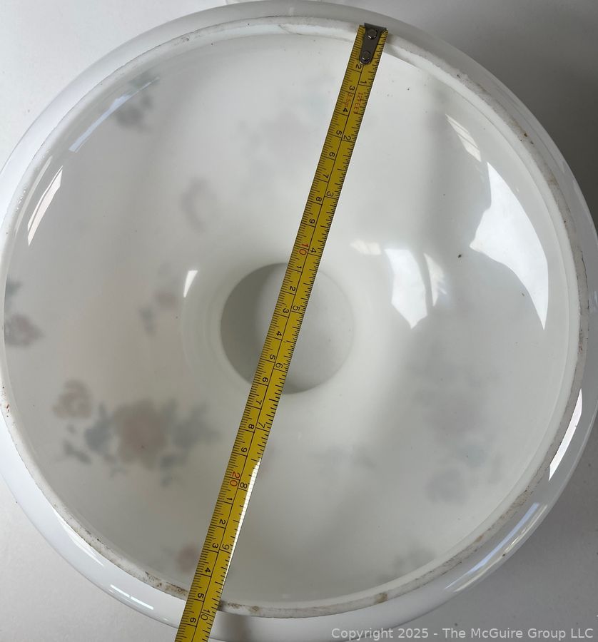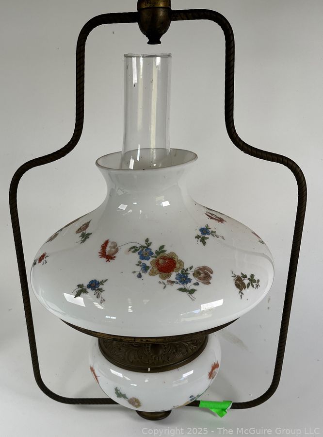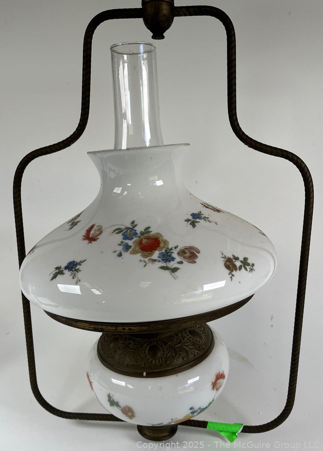 Lot #5102RM: Milk Glass with Painted Flowers Hanging Hurricane Oil Lamp