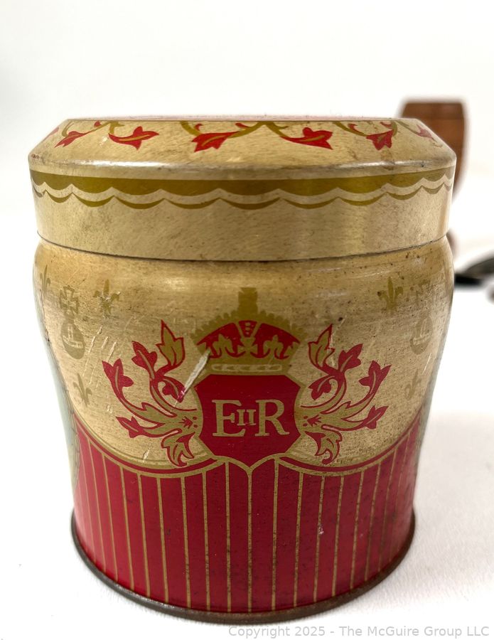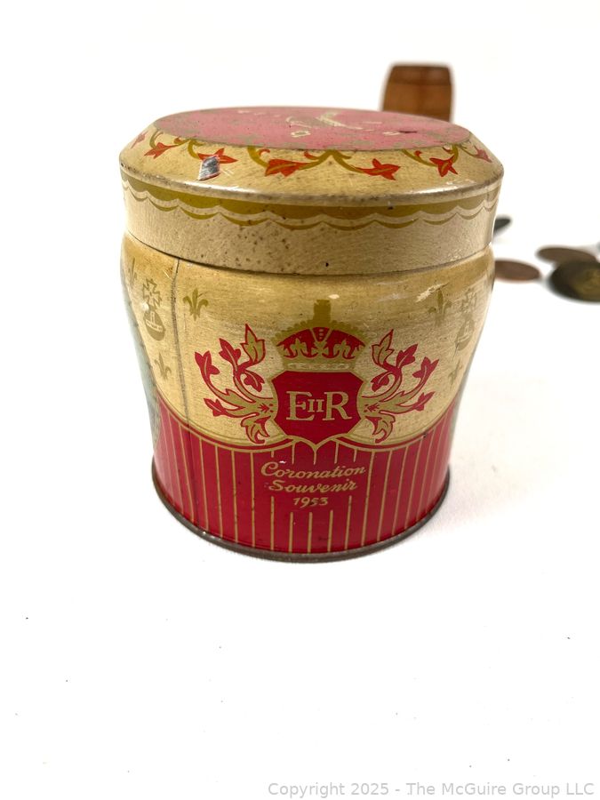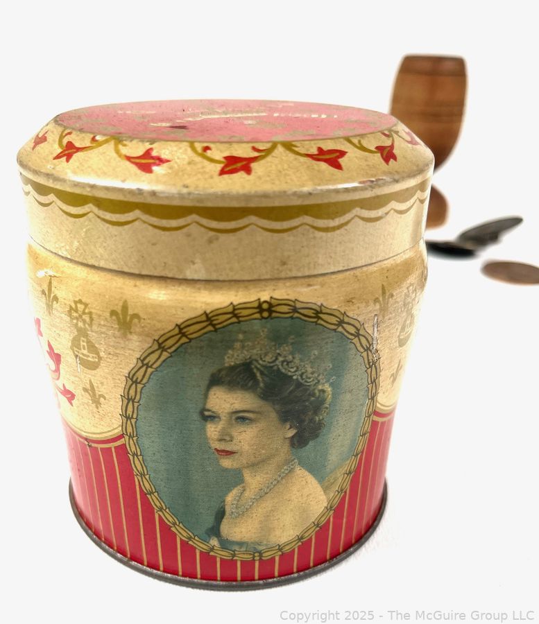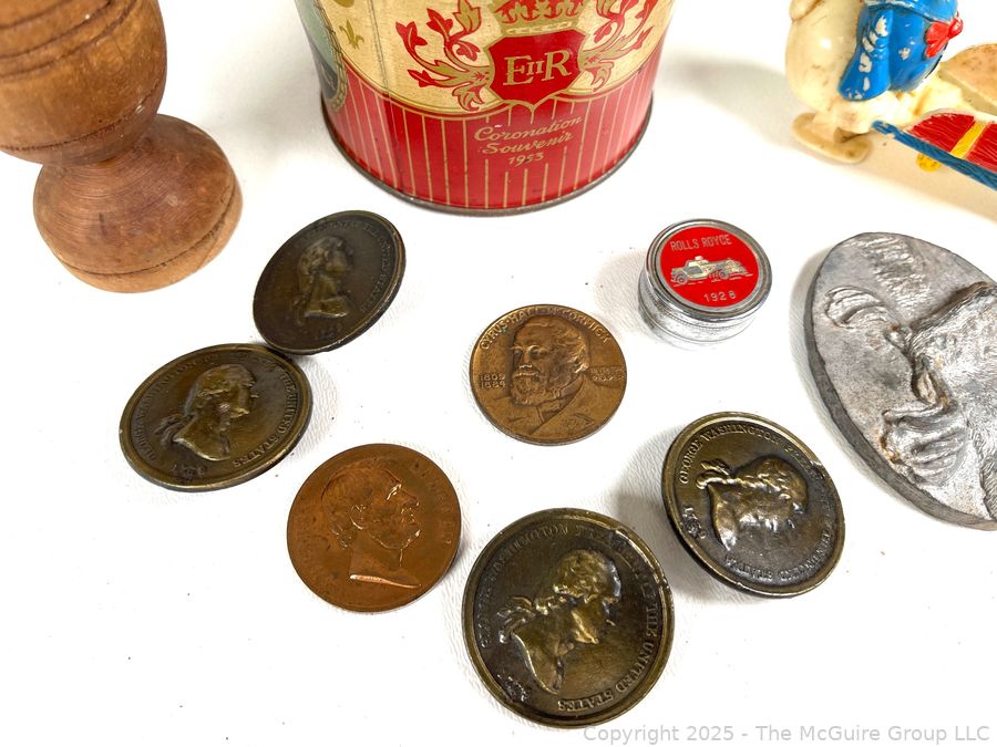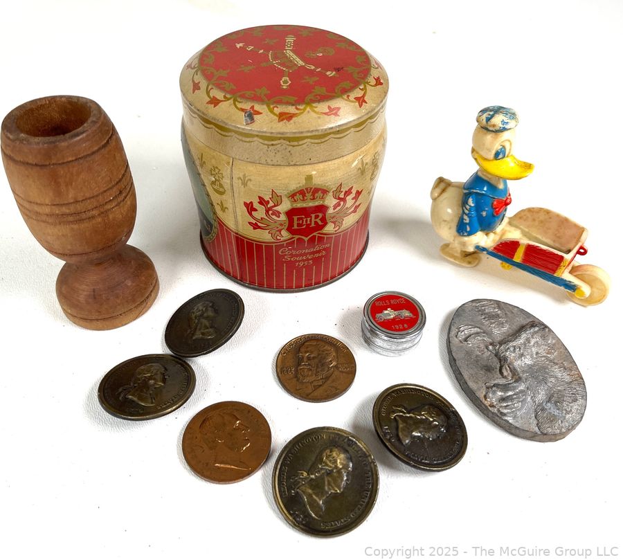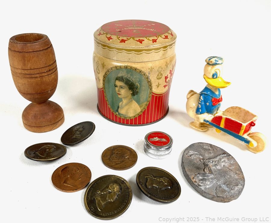 Lot #5176RM: Queen Elizabeth II Coronation Souvenir Tin, Marx Walt Disney Donald Duck Ramp Walker Toy, Wood Egg Cup, Pewter Moose Medal, 1931 International Harvester Company Medal and 1972 American Revolution Bicentennial Commemorative Medal