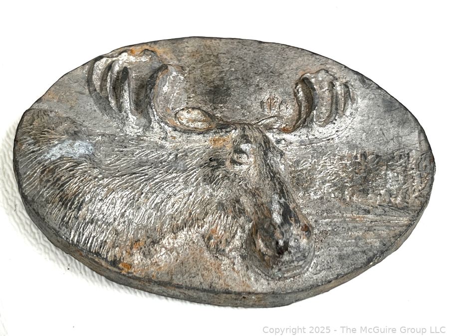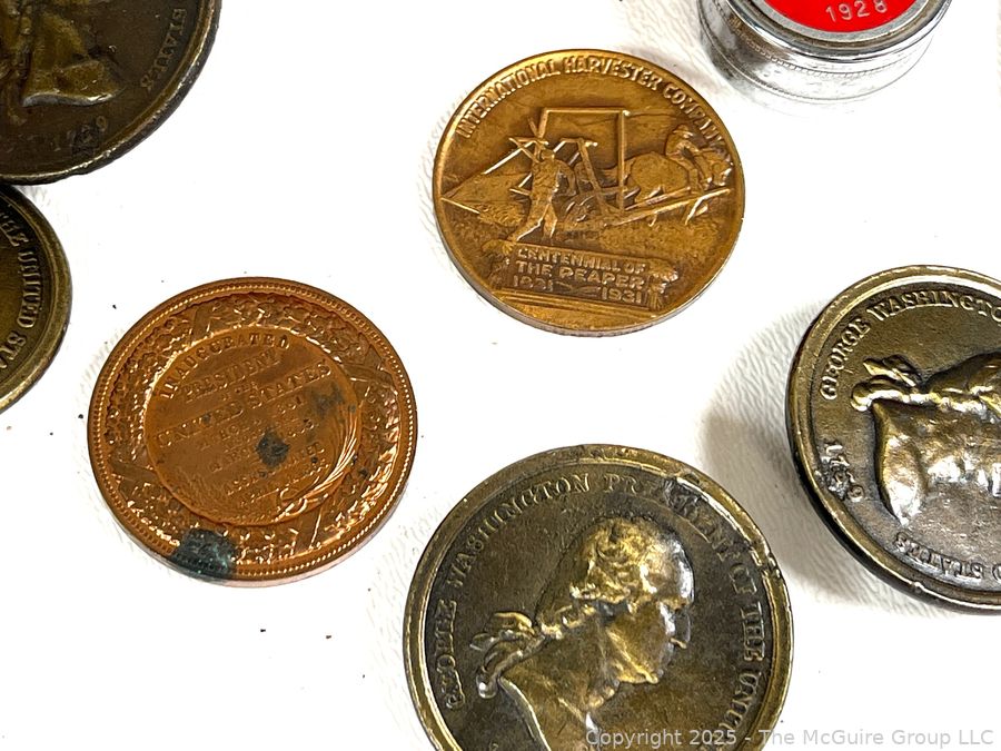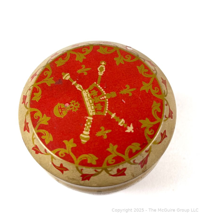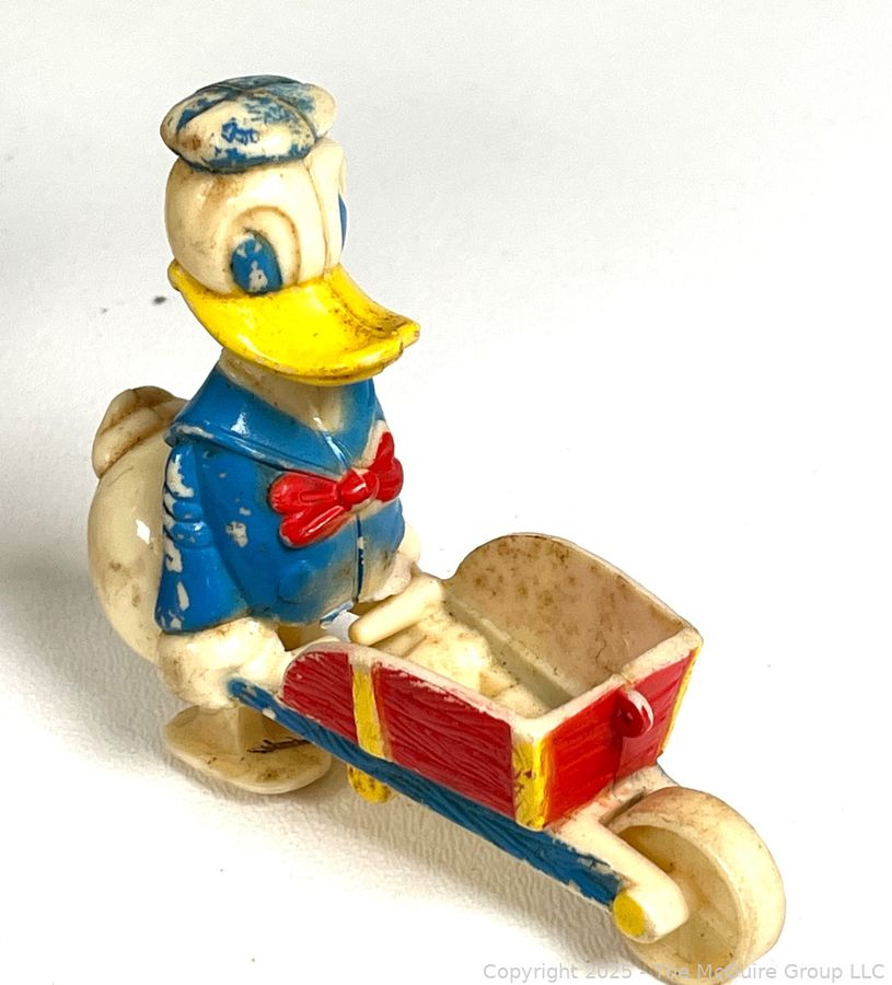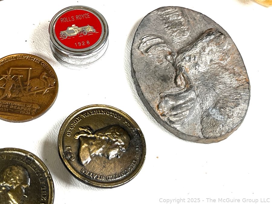 Lot #5176RM: Queen Elizabeth II Coronation Souvenir Tin, Marx Walt Disney Donald Duck Ramp Walker Toy, Wood Egg Cup, Pewter Moose Medal, 1931 International Harvester Company Medal and 1972 American Revolution Bicentennial Commemorative Medal