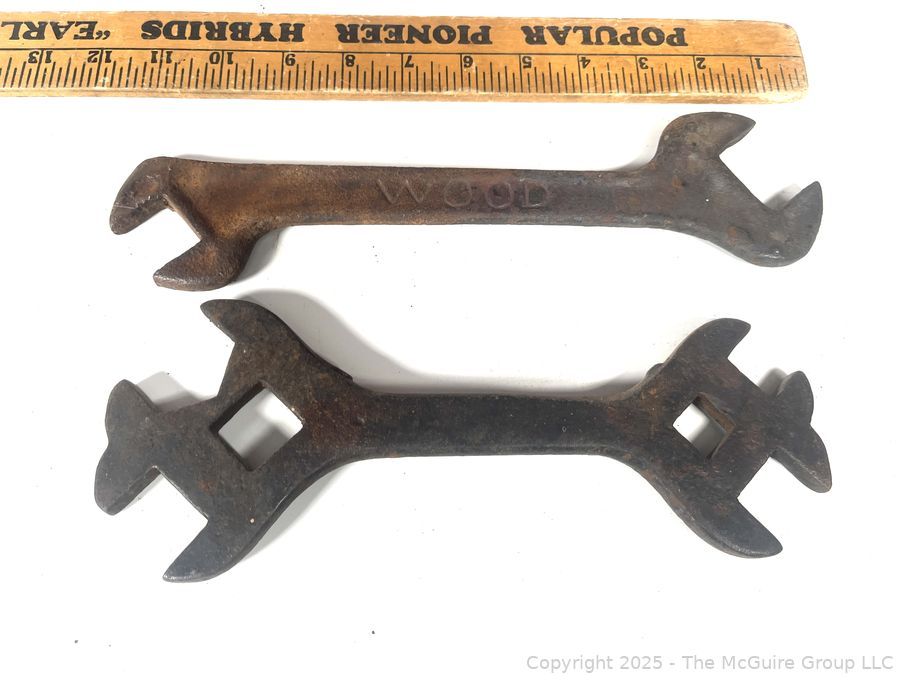 Lot #0810RM: Two (2) Cast Iron Open-Ended Box Wrenches, One Marked Wood