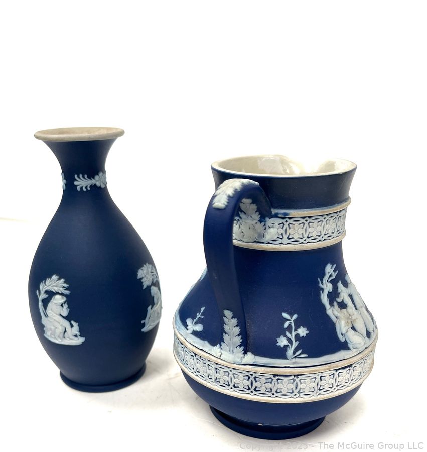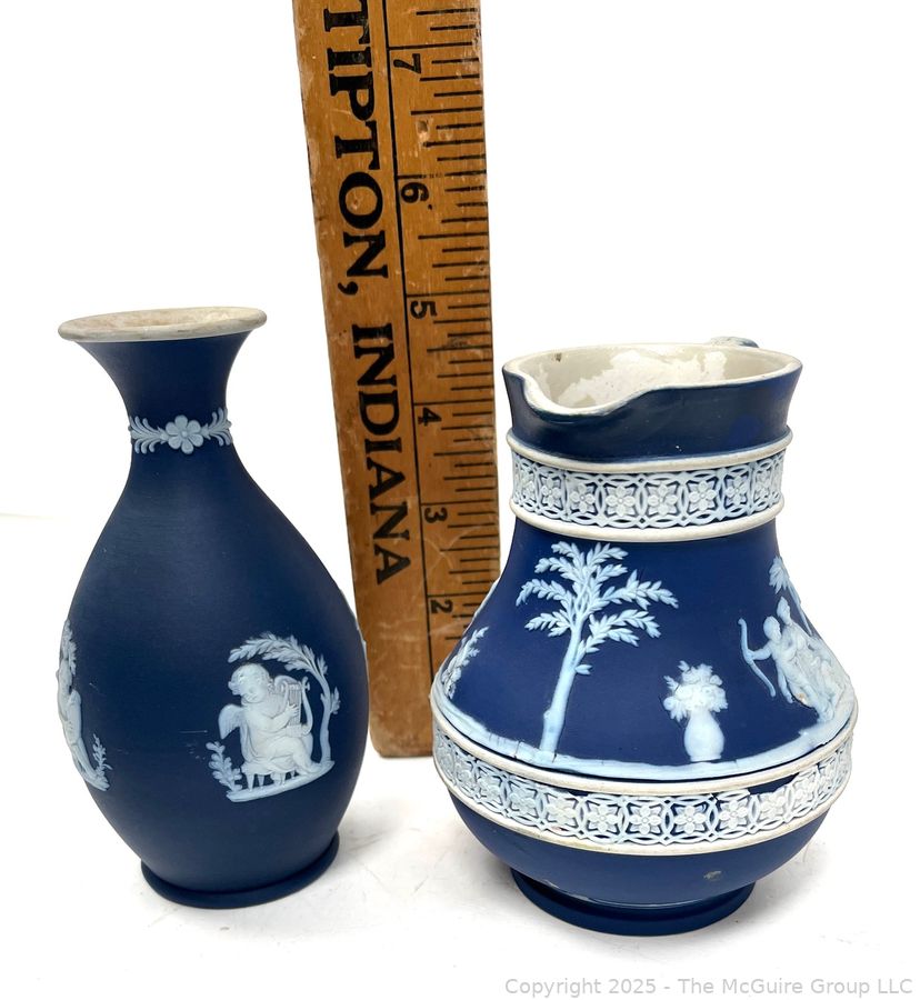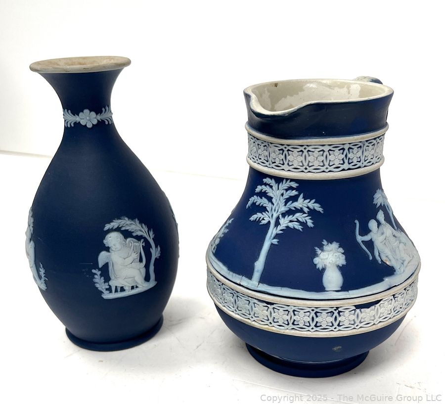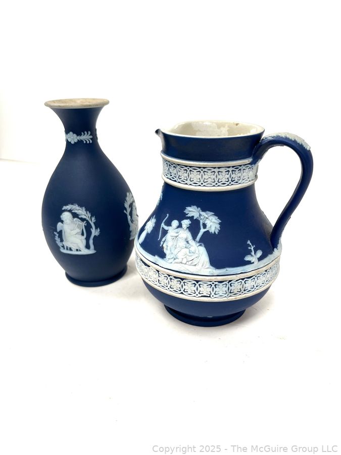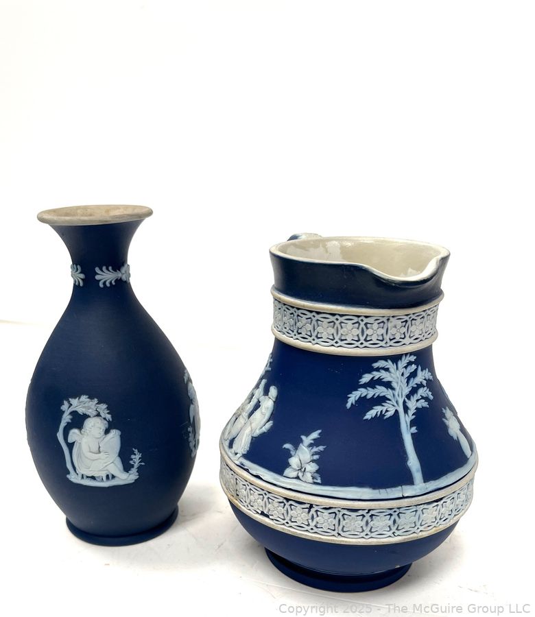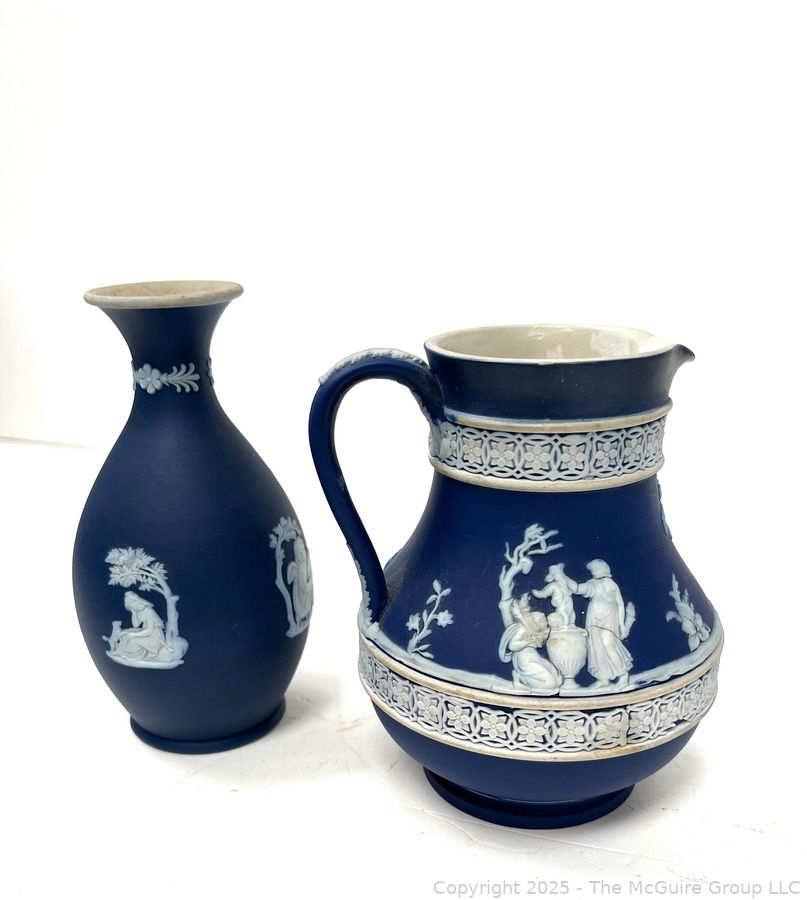 Lot #0886RM: Two (2) Pieces Cobalt Blue English Wedgwood Jasperware Jug and Vase