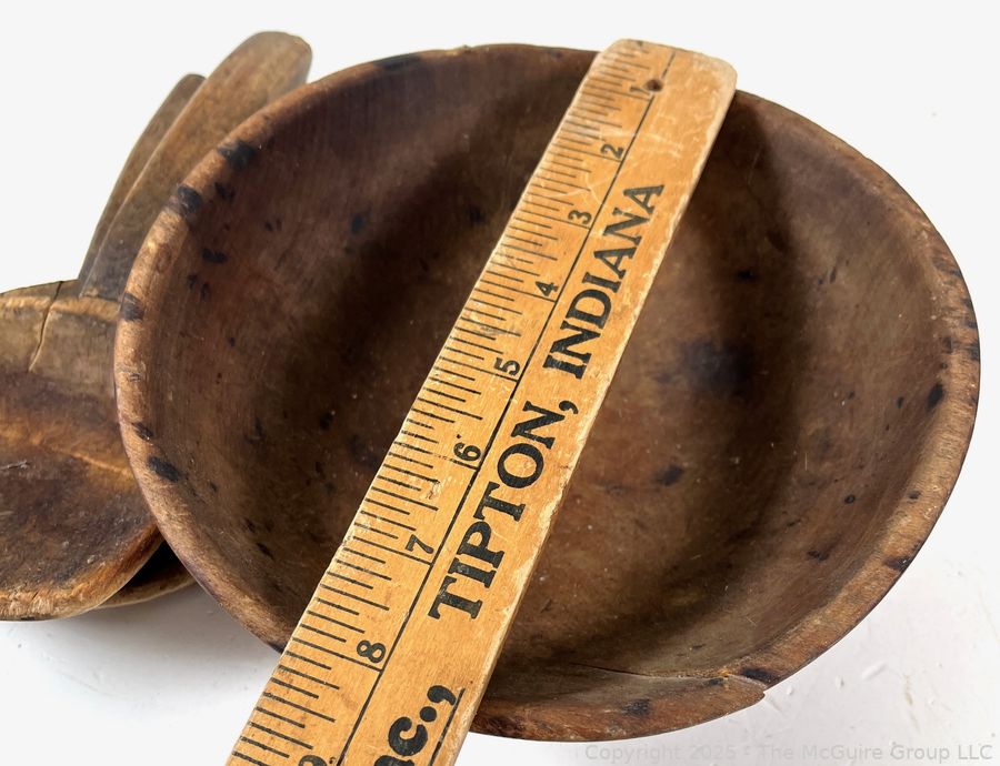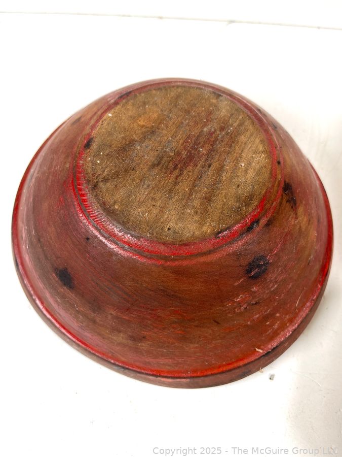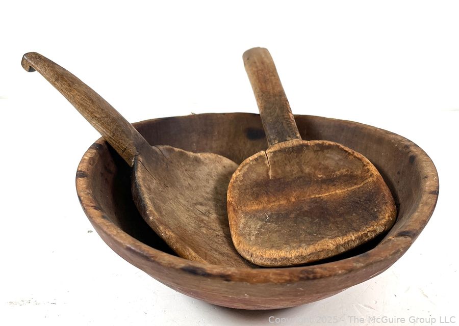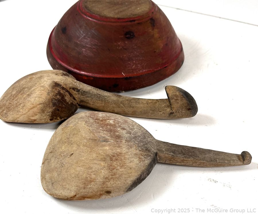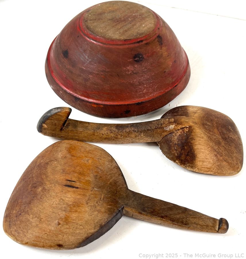 Lot #1003RM: Wooden Bowl with Original Paint and 2 Butter Paddles Treenware