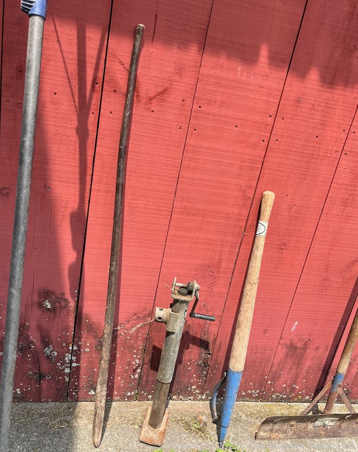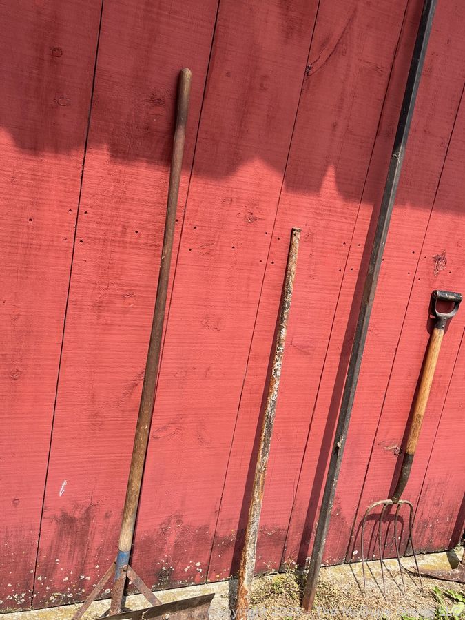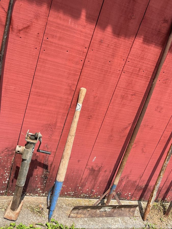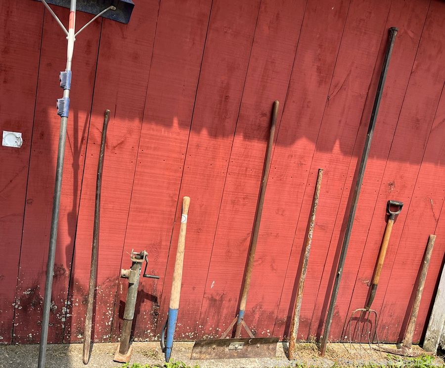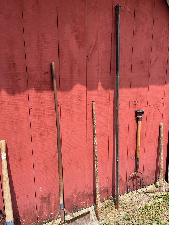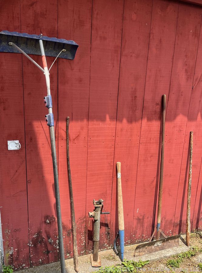 Lot #1403RM: Collection of Lawn and Garden Tools Including Roof Snow Scraper, Crowbars, Drawbar Jack, Barn Floor Scraper, Silage Fork, Pic Axe and Log Peavey