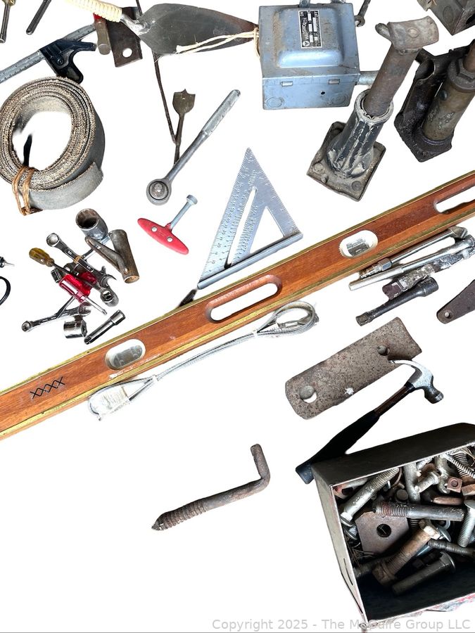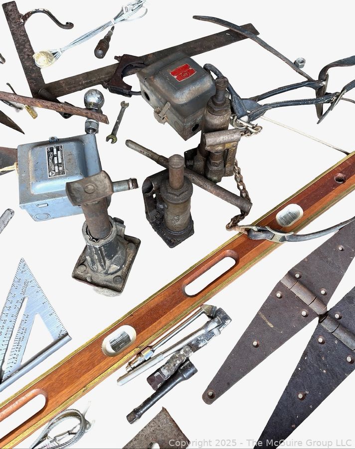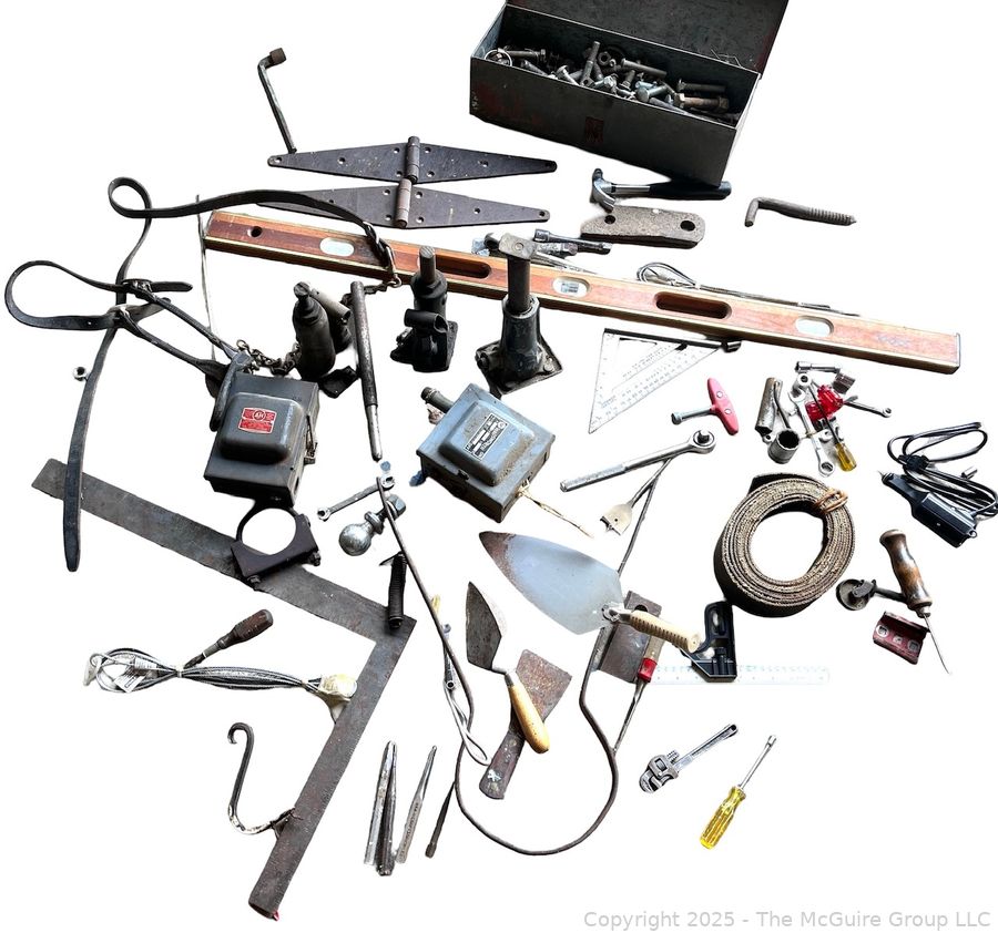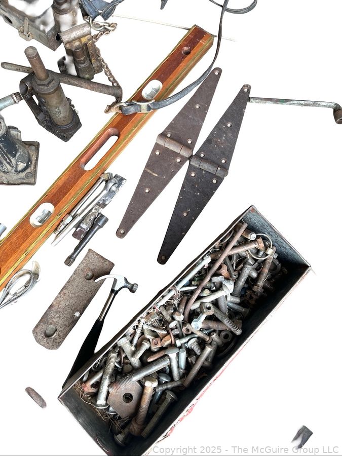 Lot #1394RM: Farm Hardware Supplies and Hand Tools Including Steel Hinges, 48" Level and Electrical Boxes