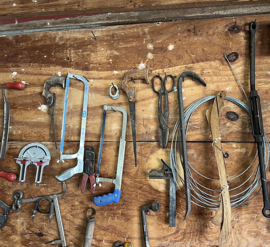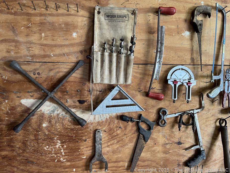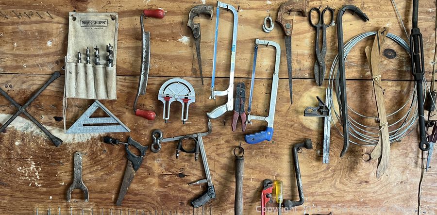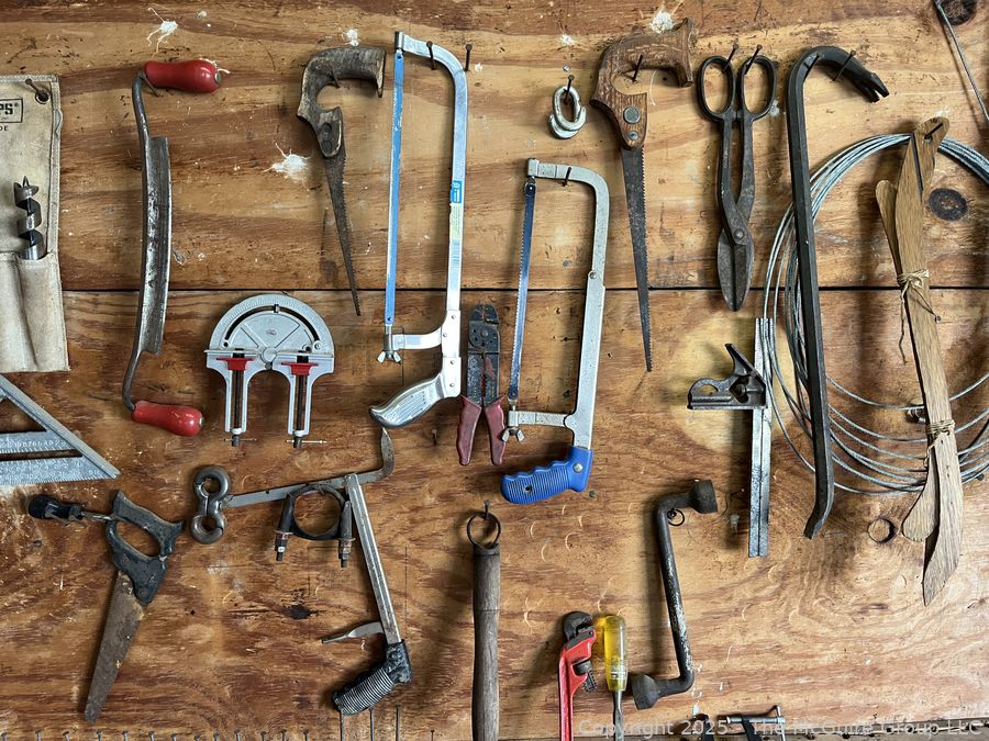 Lot #1376RM: Grouping of Bench Tools Including Saws, Shears, Breaker Bar, Drawshave and Wood Templates