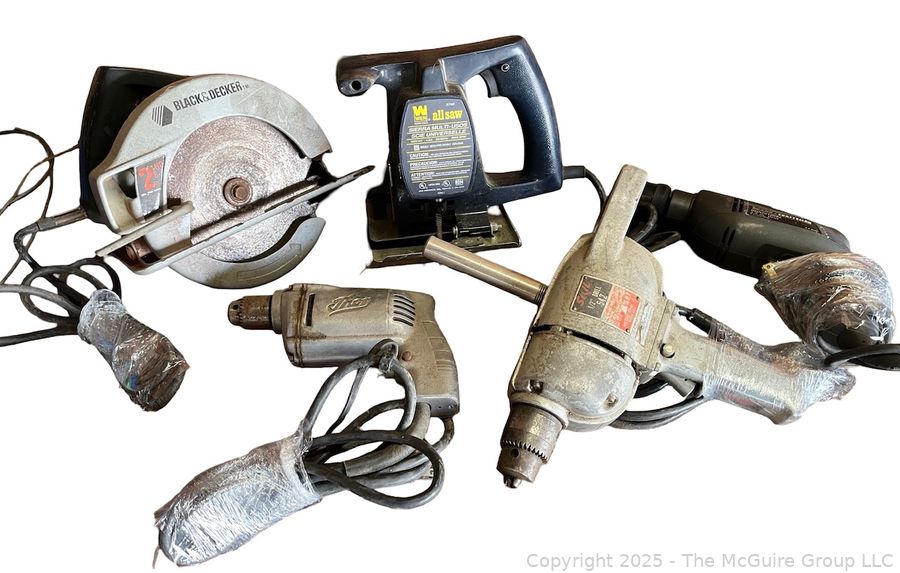 Lot #1384RM: Grouping of Corded Tools Including Circular Saw, 3/8" Craftsman Drill, 1/2" Skil Drill, Thon Drill and WEN All Saw