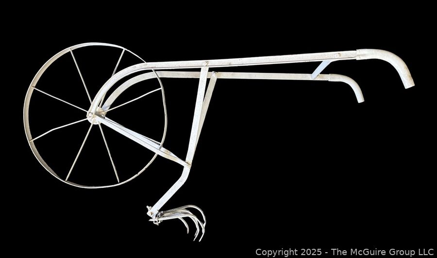 Lot #1412RM: Vintage Iron Wheeled Hand Powered Garden Cultivator. Painted White