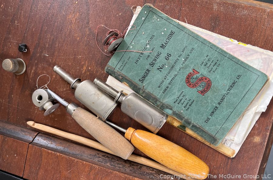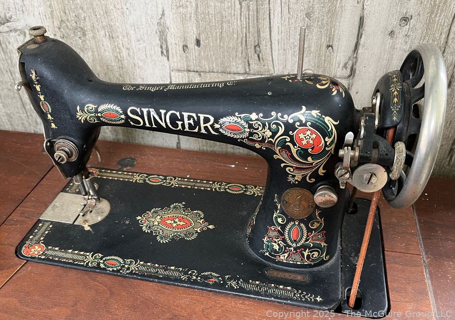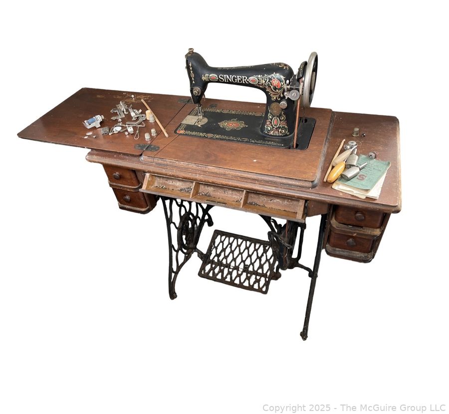 Lot #4001RM: Vintage SINGER "Red Eye" Model Treadle Sewing Machine and Cabinet w/ Accessories.
