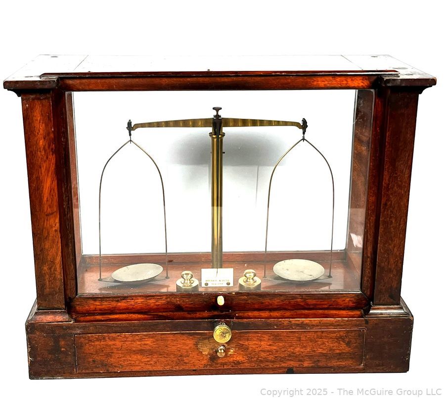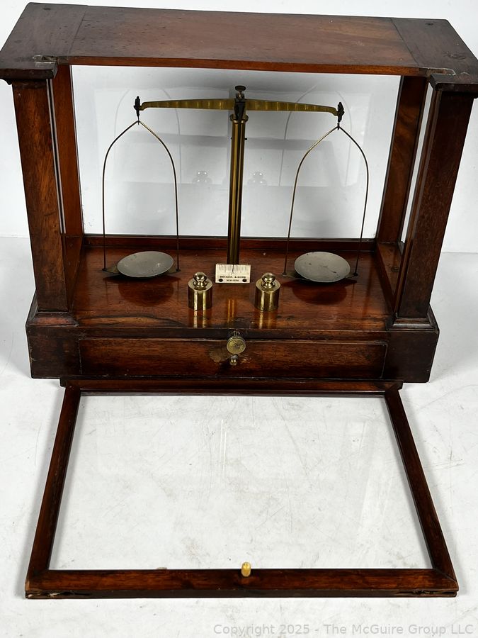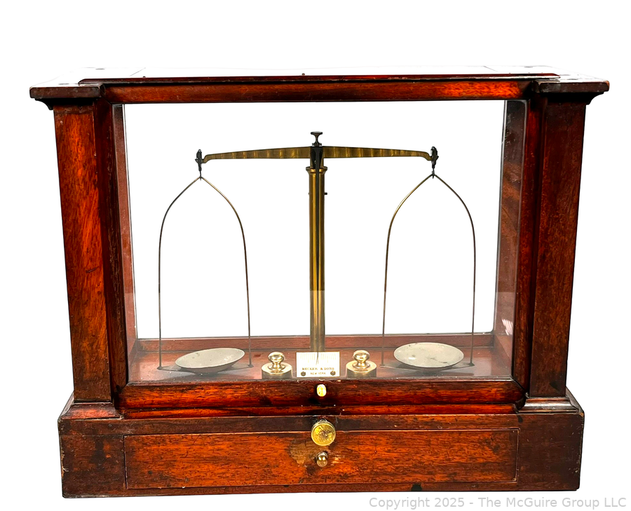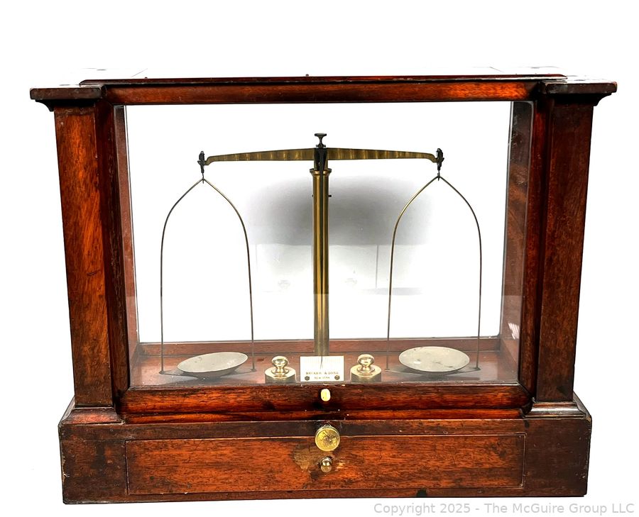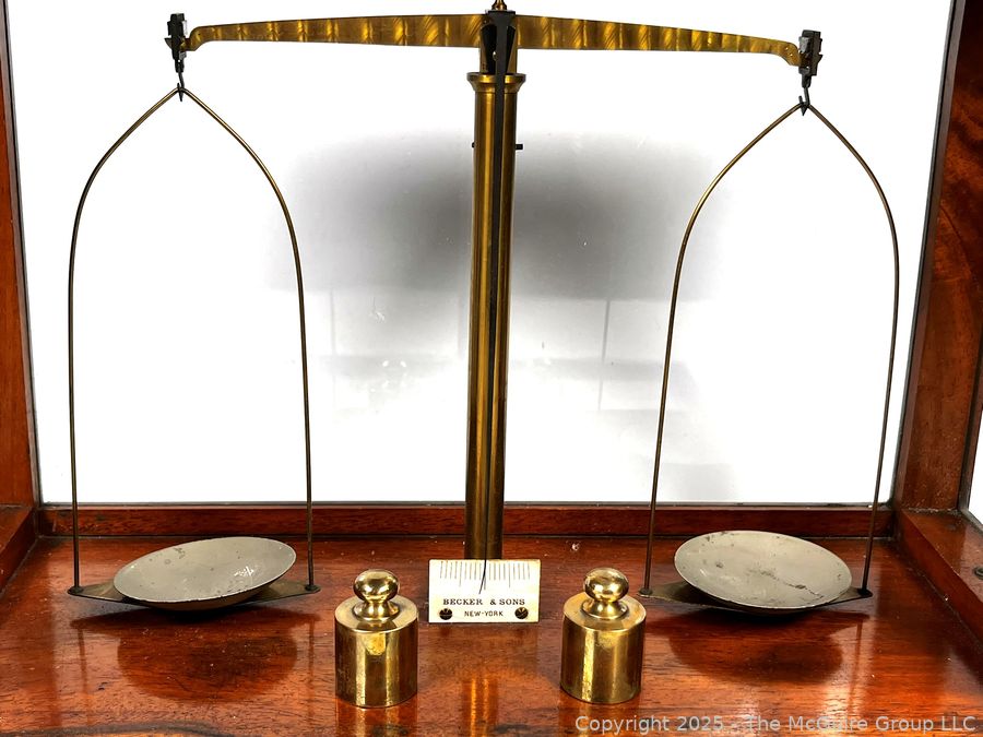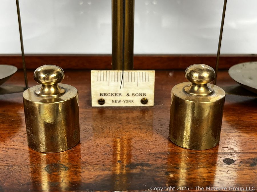 Lot #0135CP: 19th Century Becker & Sons Gold Apothecary Scale in Mahogany Glass Case