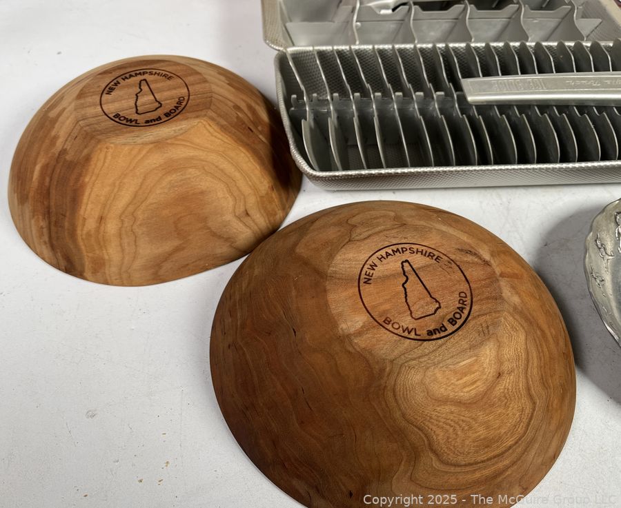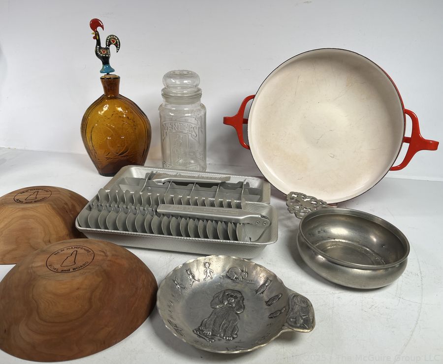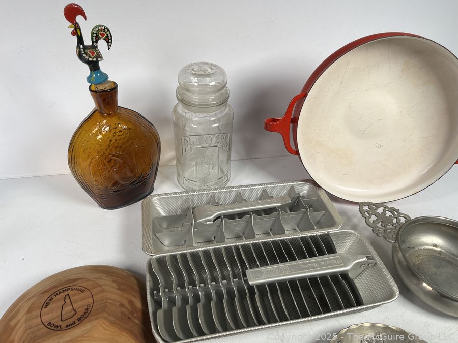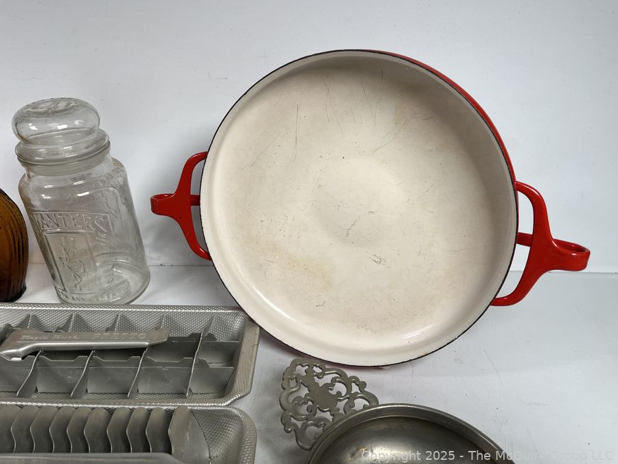 Lot #0258JK: Kitchenware Including Wooden Bowls, Aluminum Ice Trays and Red Dansk Kobenstyle Enamel Paella Pan.