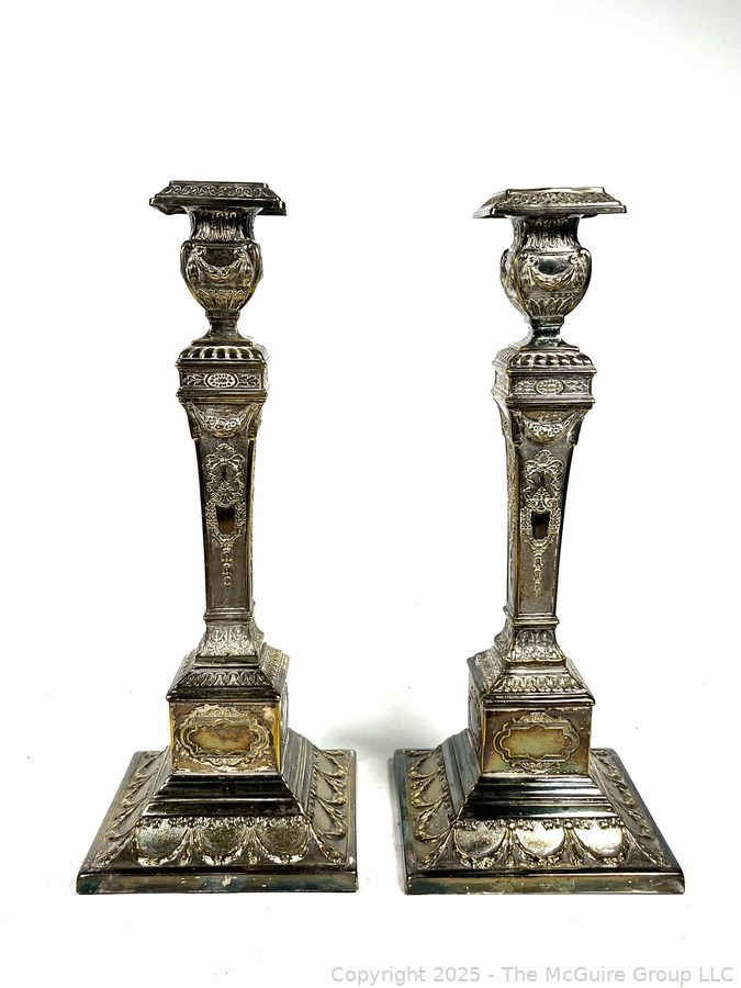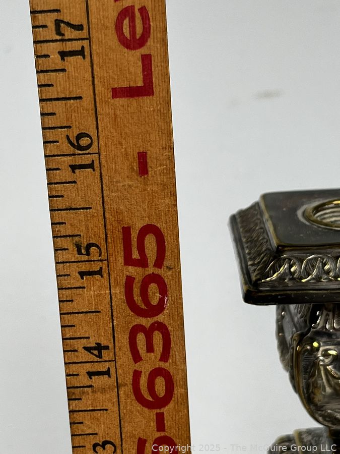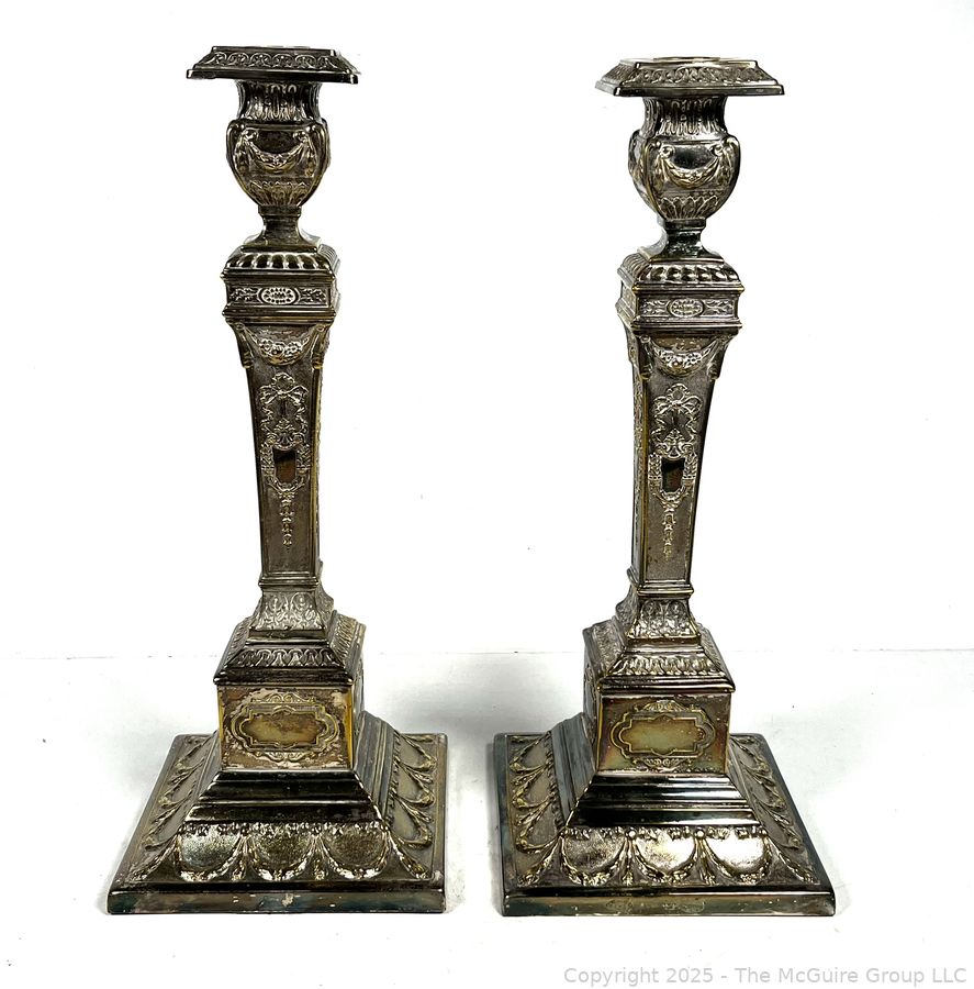 Lot #0126CP: Pair of B. Henneberg Warszawa Silver Plated Shabbat Candlesticks Warsaw Poland