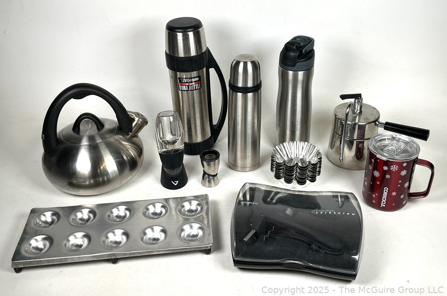 Lot #0239PB: Stainless Steel Cookware Including Ravioli Molds, Coffee Carafes, Teapot and Rabbit Wine Bottle Opener
