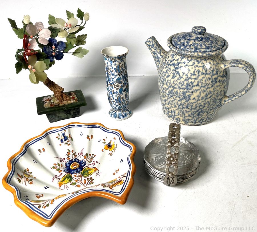Lot #0243JK: Talavera Portugal Serving Plate, Blue Spongeware Coffee Pot, Aluminum Coasters and Chinese Stone Bonsai Tree