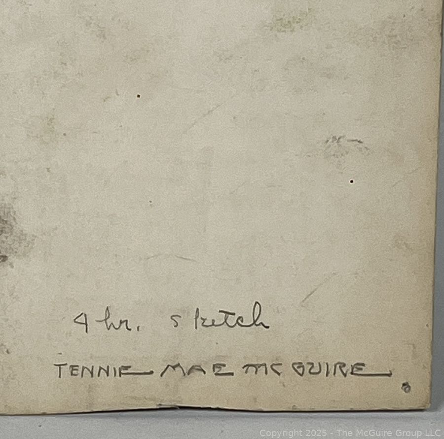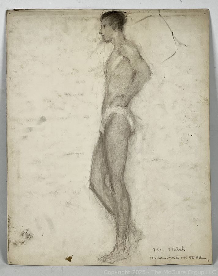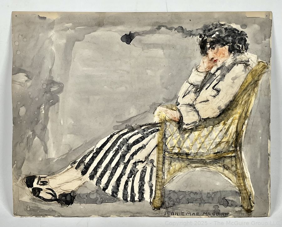 Lot #0035RTM: Unframed Double Sided Watercolor on Paper Portrait of Woman Reclining in Chair and Nude Male Signed by Artist Jennie Mae McGuire circa 1915. Measures 14.5 x 18"