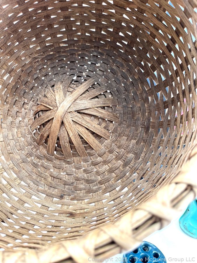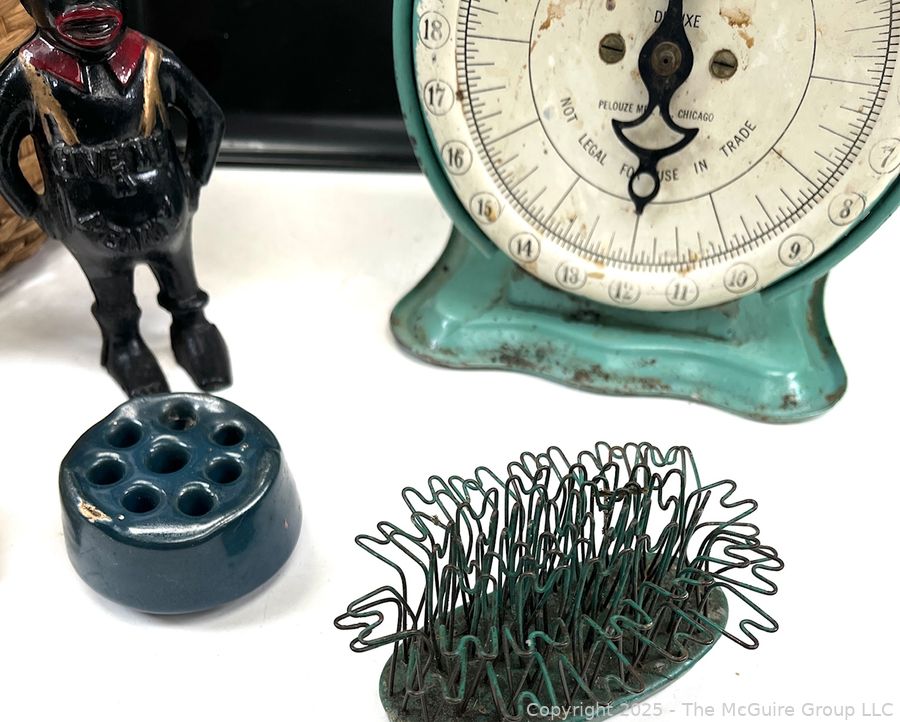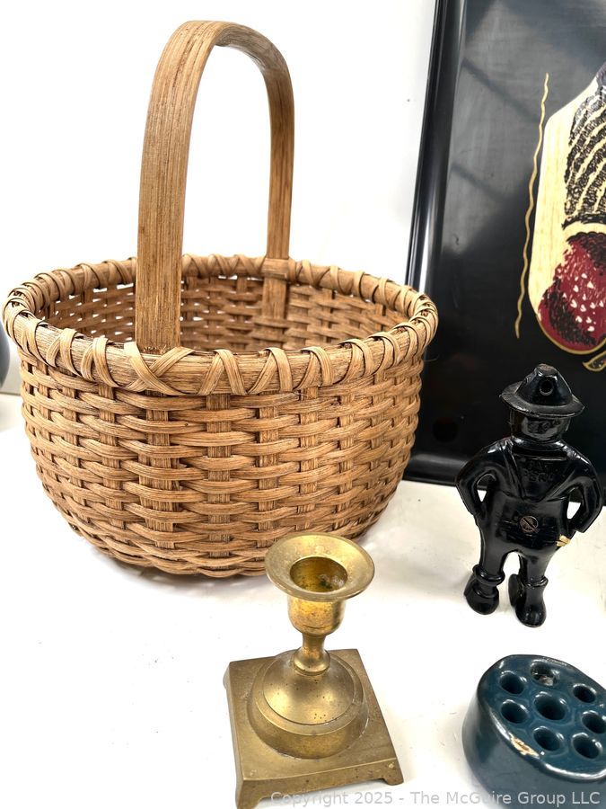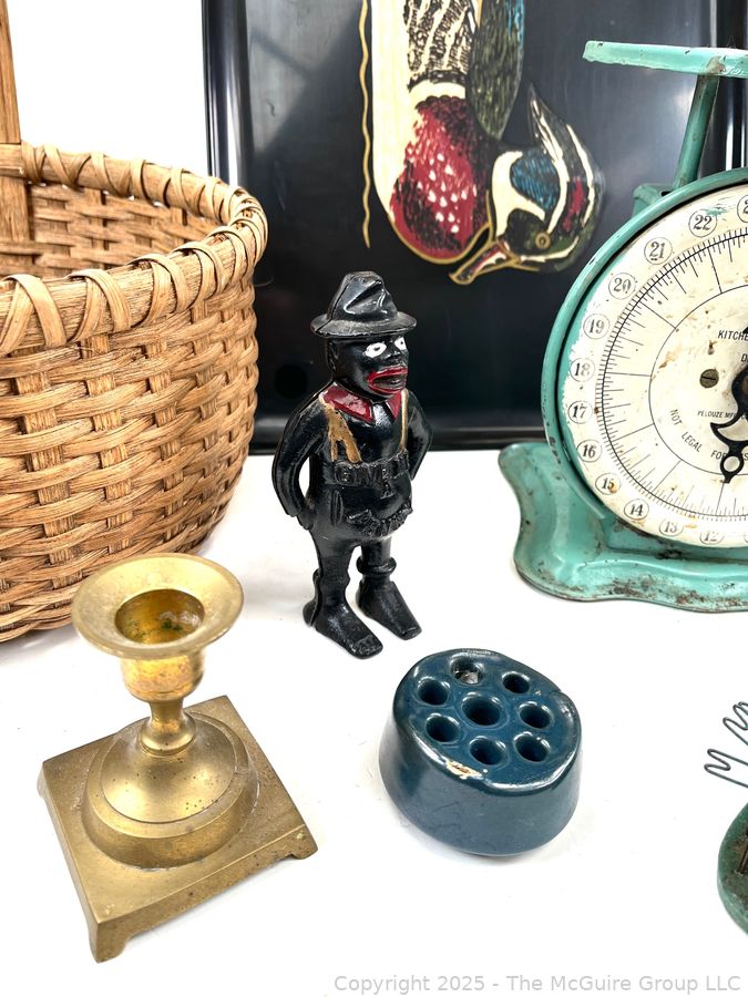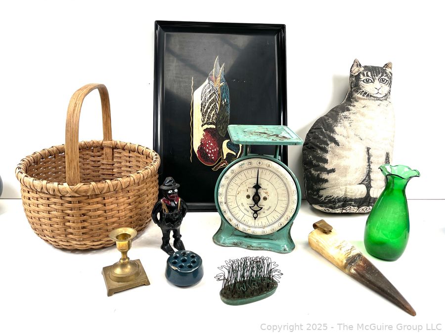 Lot #0916RM: Gathering Basket, Serving Tray, Flower Frogs, Family Scale, Bone Awl Etc