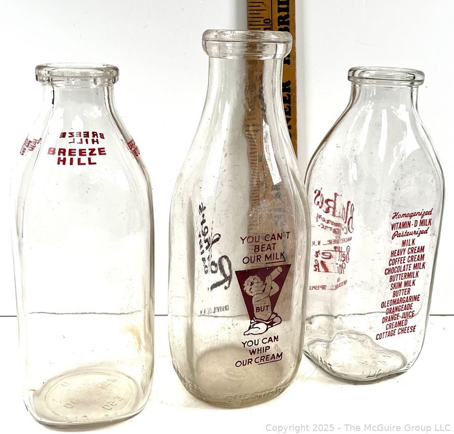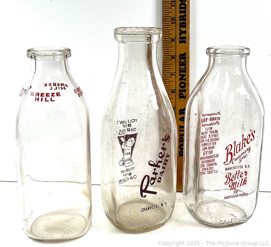 Lot #0923RM: Group of Three (3) Glass Milk Bottles Parker's, Blake's and Breeze Hill
