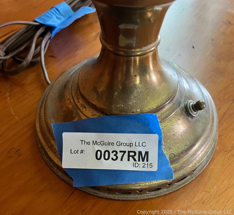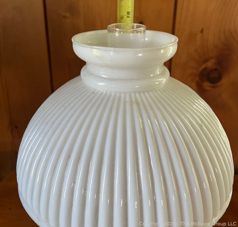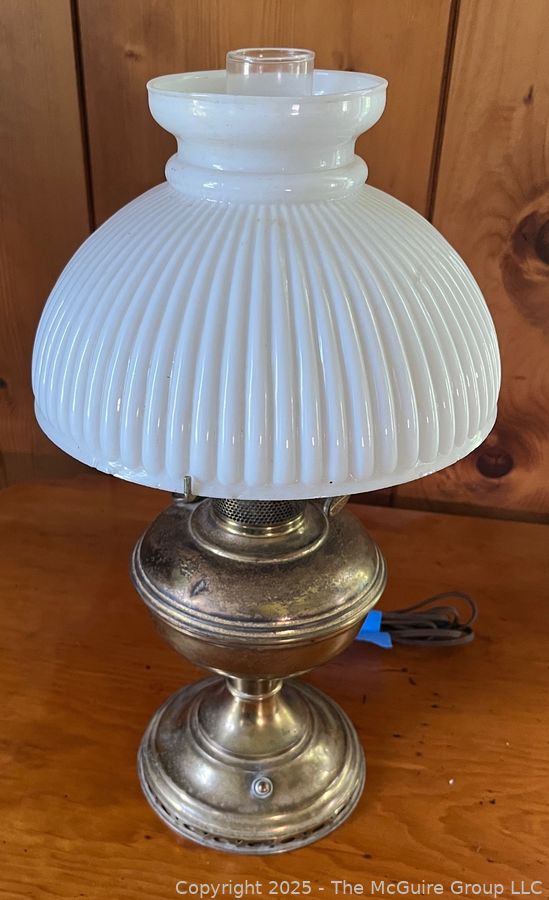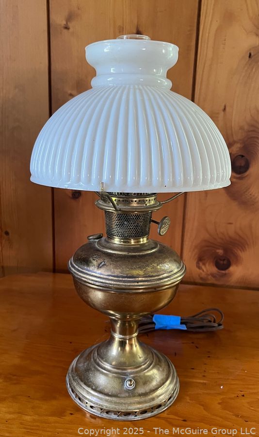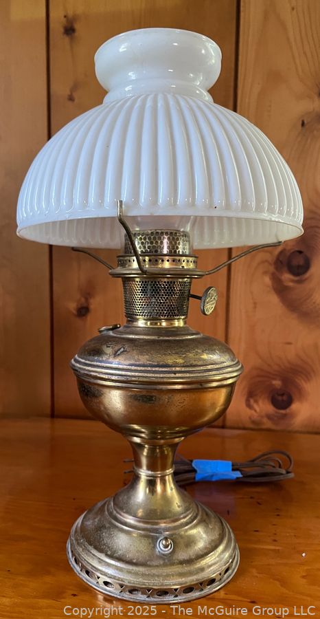 Lot #0037RM: Hurricane Style Electrified Brass Table Lamp With Milk Glass Shade