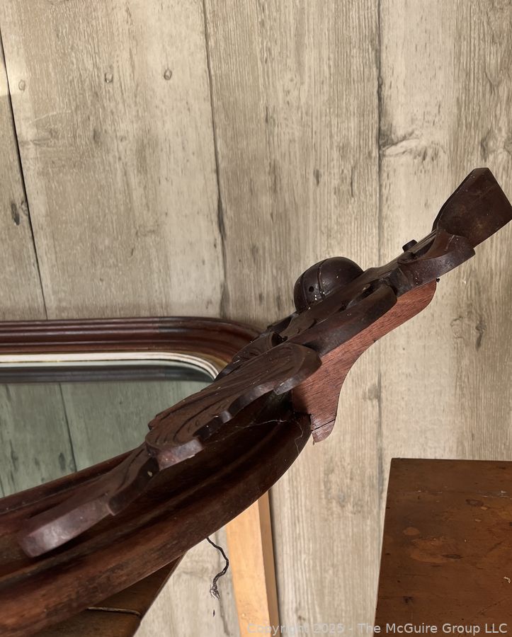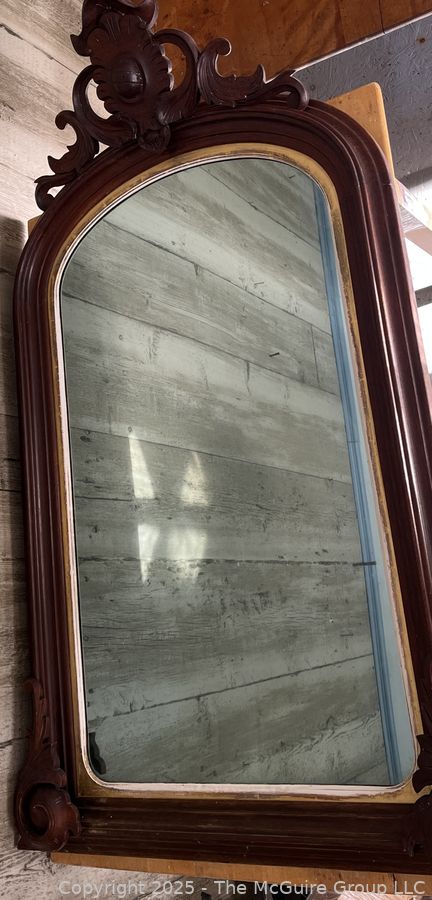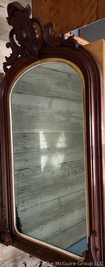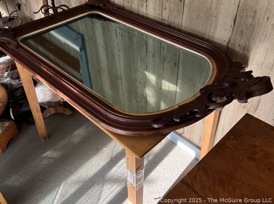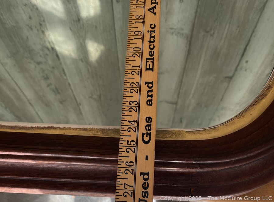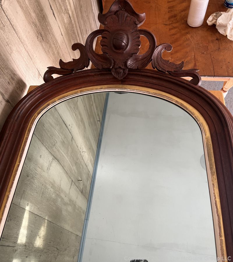 Lot #0350RM: Mahogany Wall Mount Mirror with Pediment Top. Measures 27 x 48"