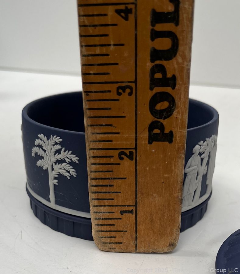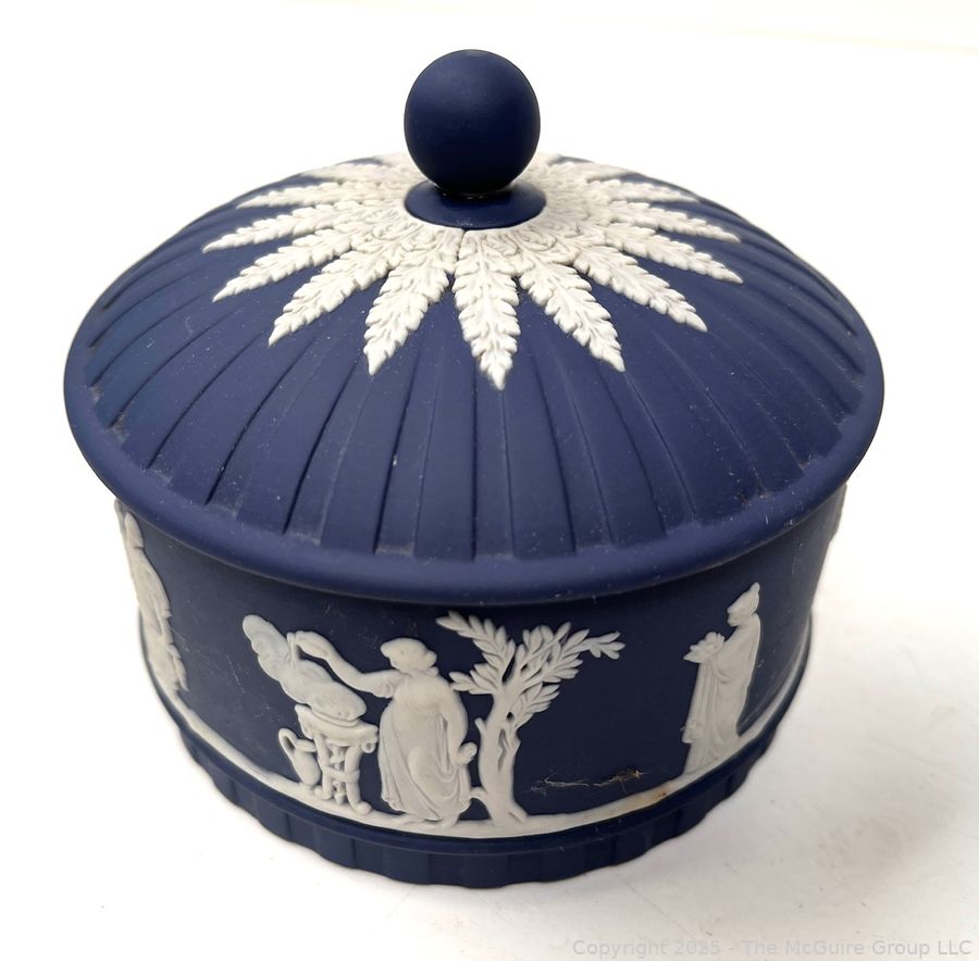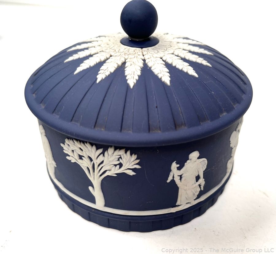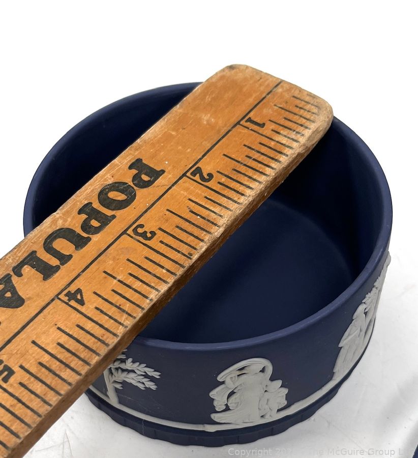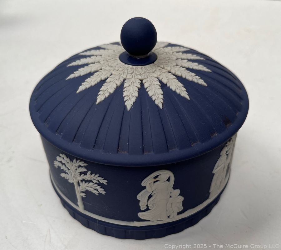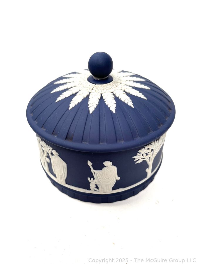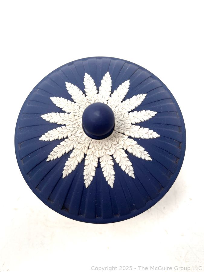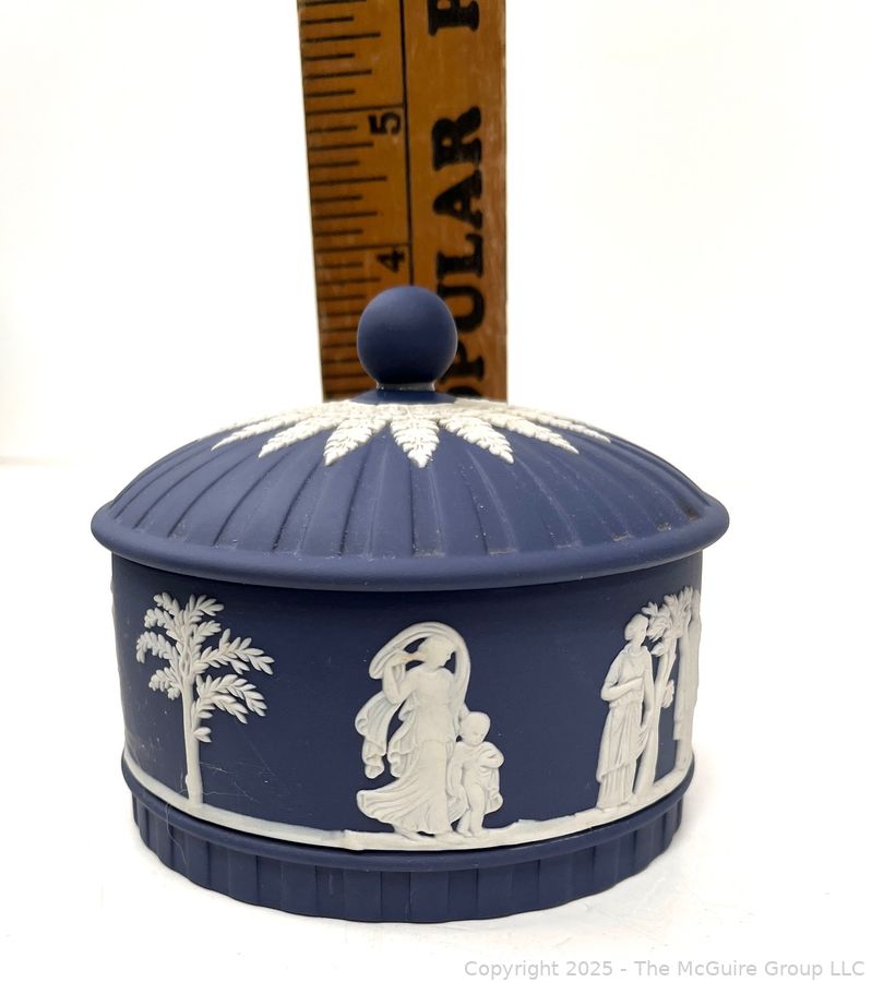 Lot #0883RM: Wedgewood Blue Jasperware Round Box w Lid Trinket Powder Vanity Decor Dish Bowl