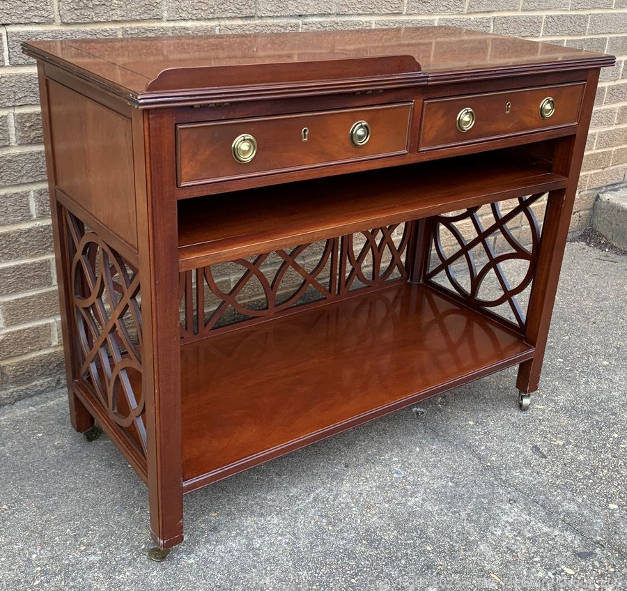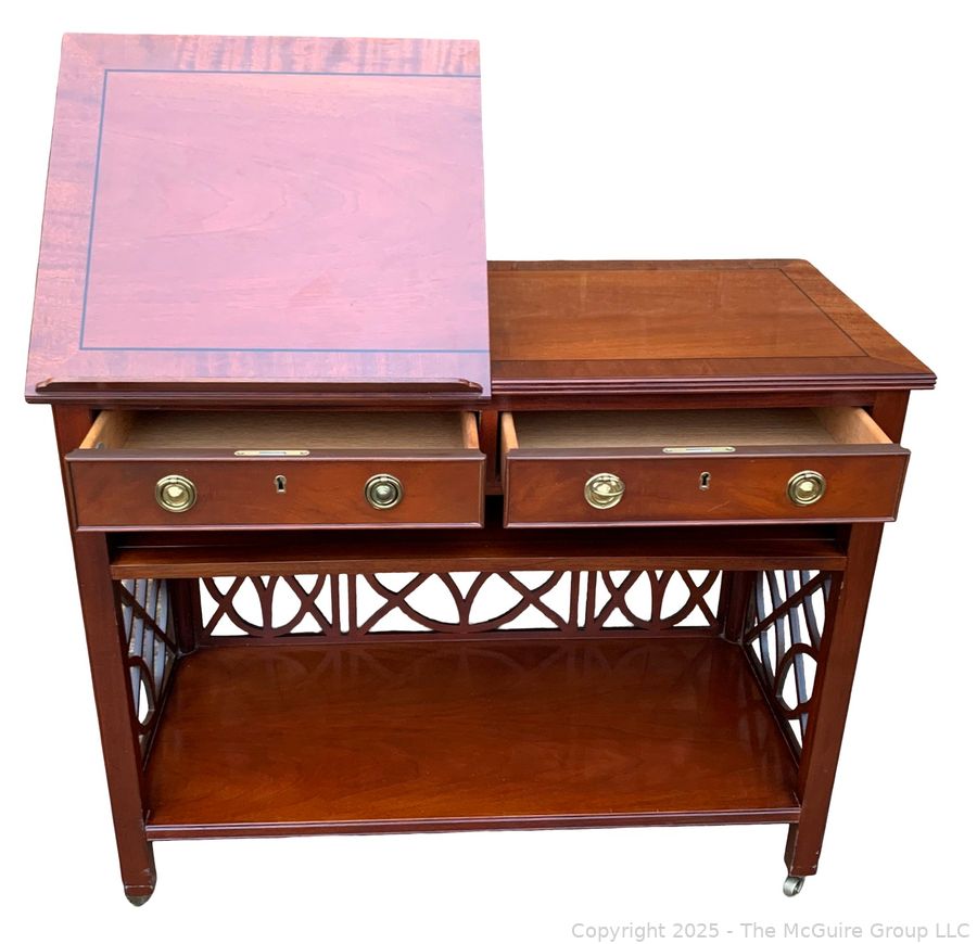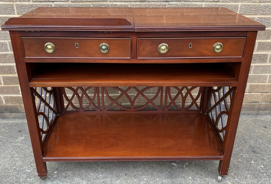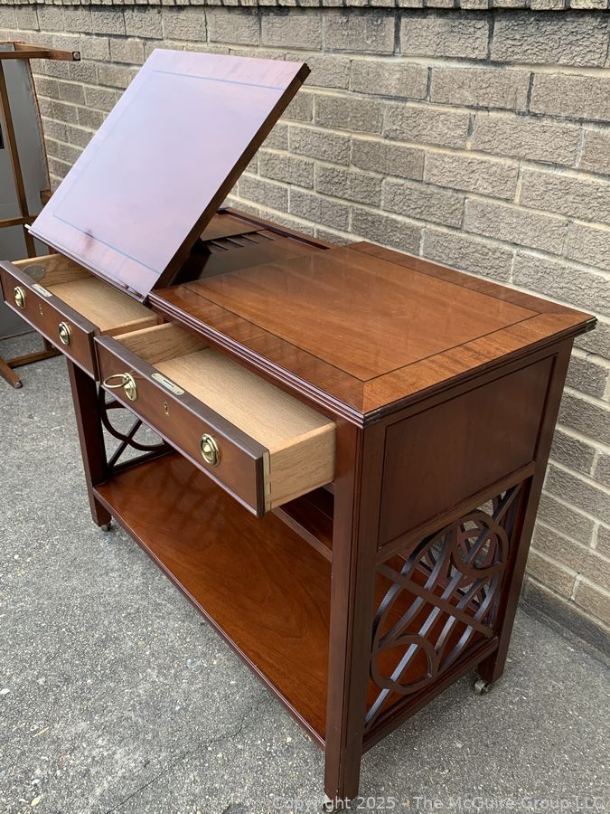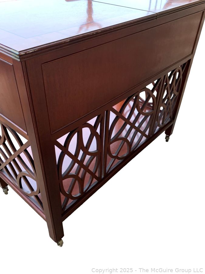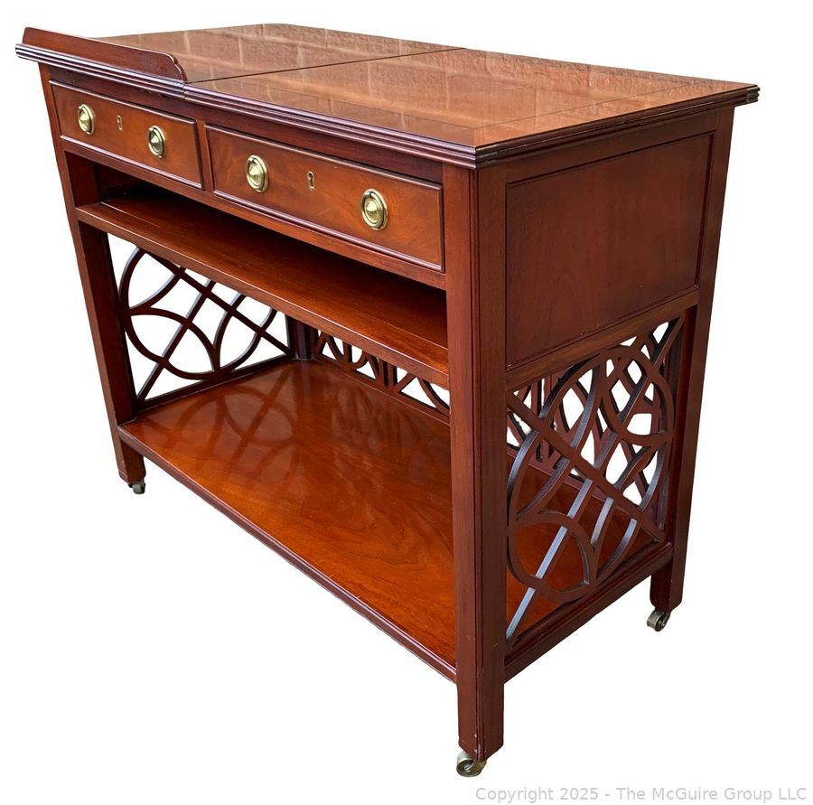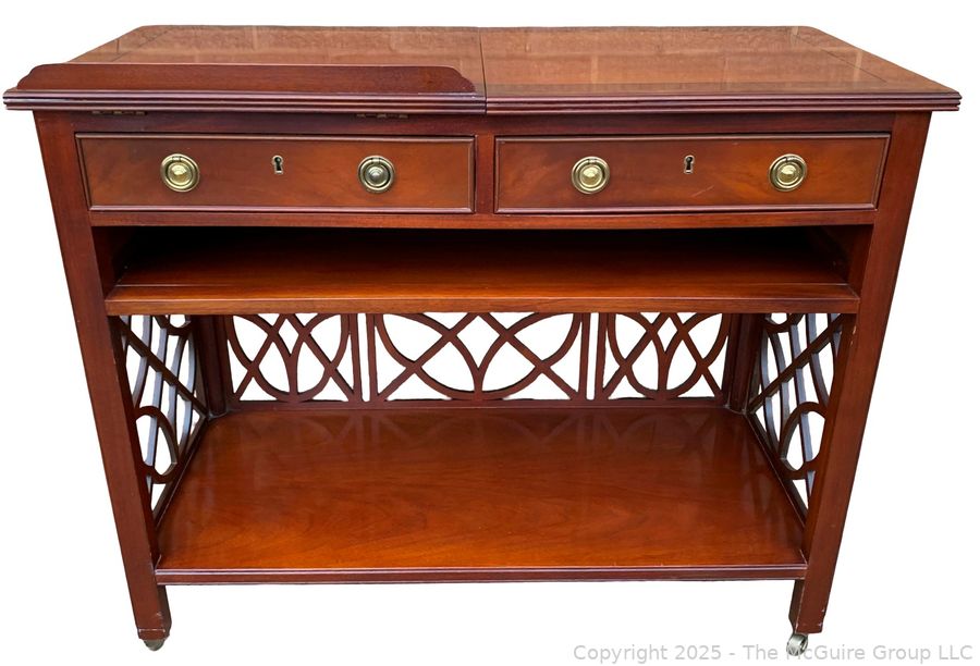 Lot #0041CS: Baker Mahogany Chippendale Style Fretwork Telephone Console Table with Tilt Top. 35"W x 17"D x 29"T