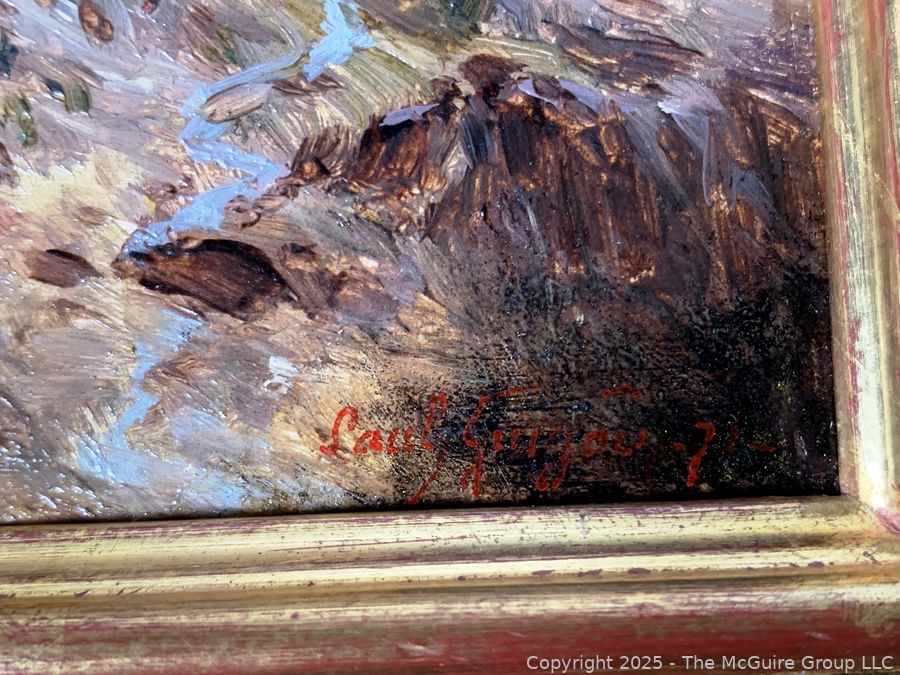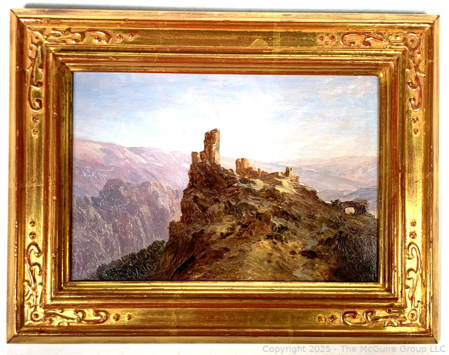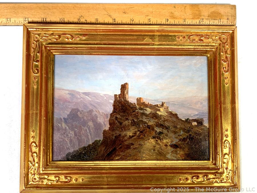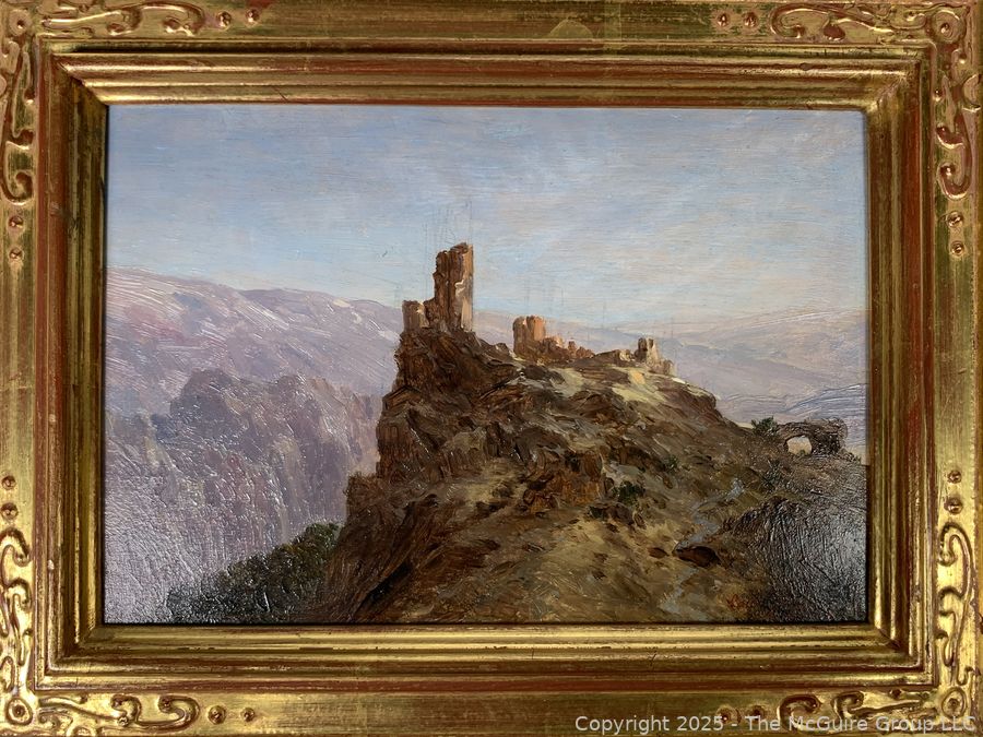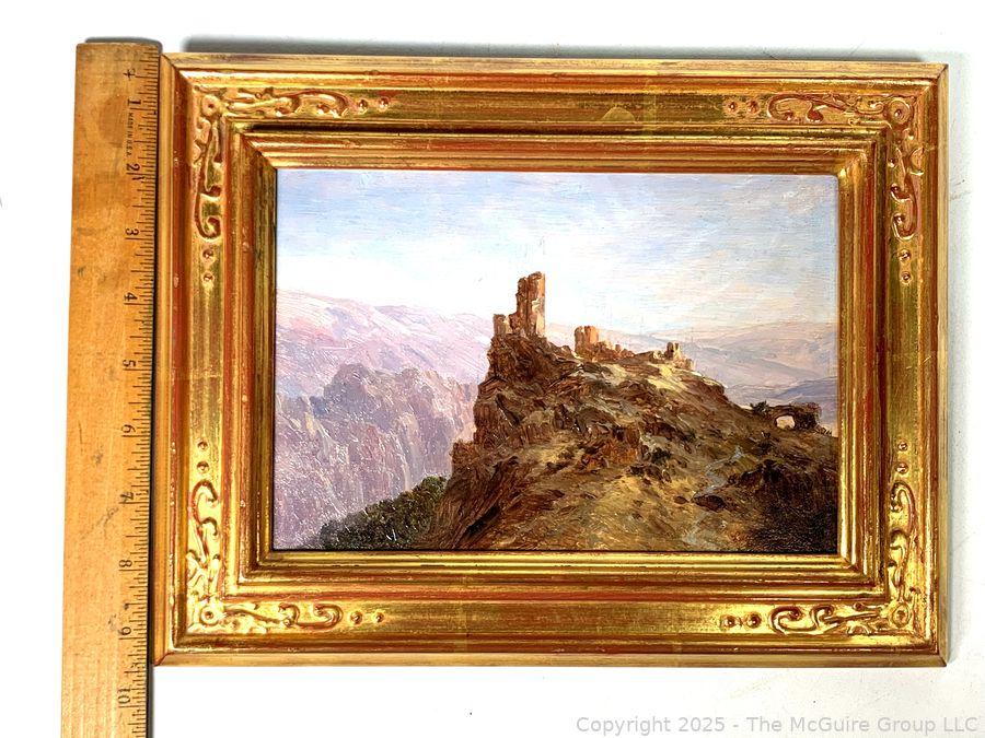 Lot #0057CS: Gilt Framed Oil on Wood of Ruins on Precipice Signed by Artist Saul Guigo, 1871. Restored by Justine Wimsatt, Wimsatt & Assoc in 2002. 9" x 12"