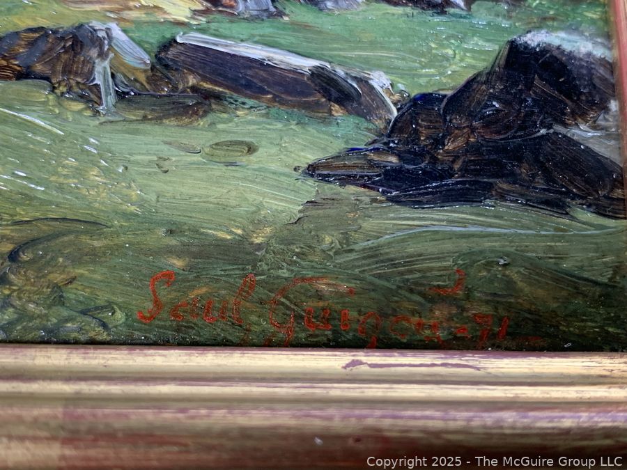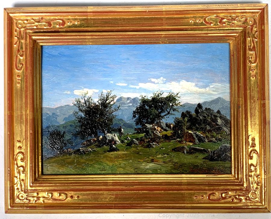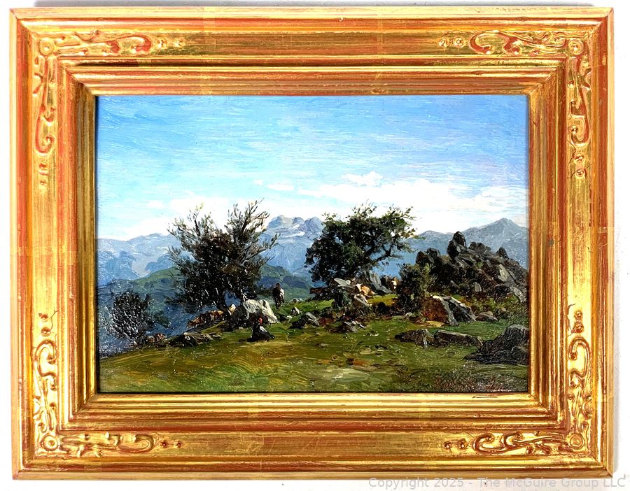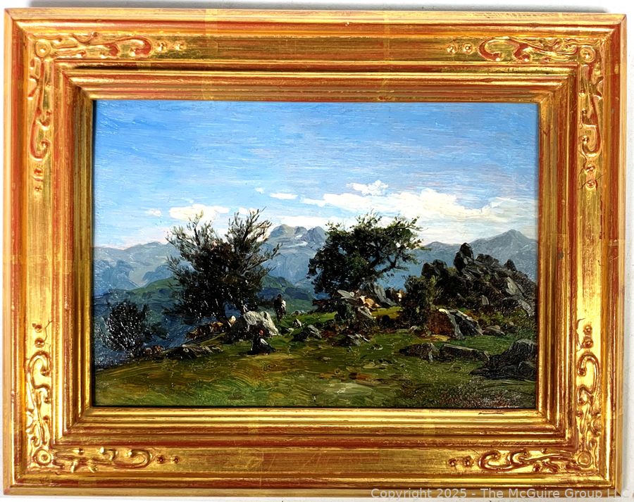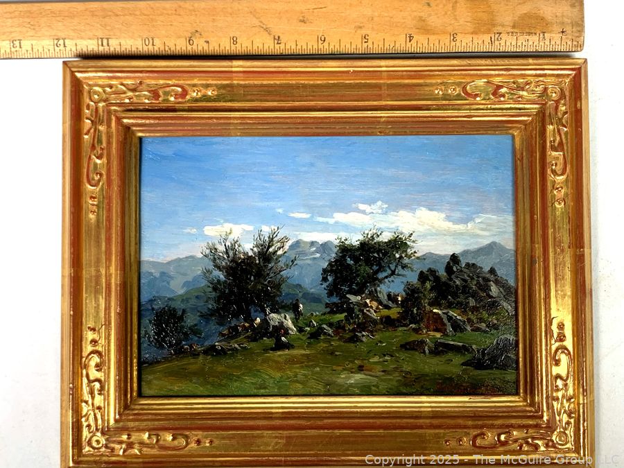 Lot #0051CS: Gilt-Framed Oil on Wood of Shepherds with Cow on Hilltop Signed by Artist Saul Guigo, 1871. Restored by Justine Wimsatt, Wimsatt & Assoc in 2002. 9" x 12"