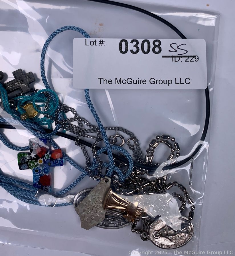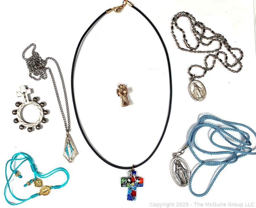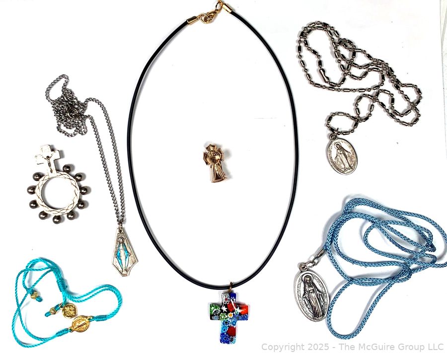 Lot #0308SS: Group of Religious Medals, Millefiori Glass Cross Pendant and Pocket Rosary