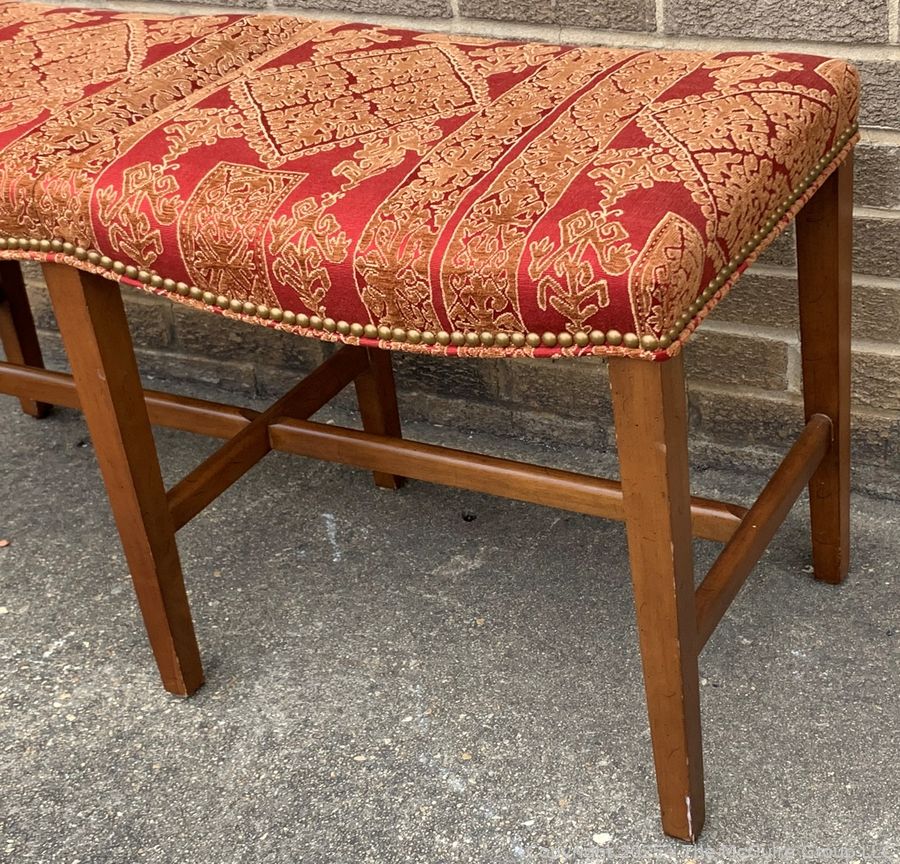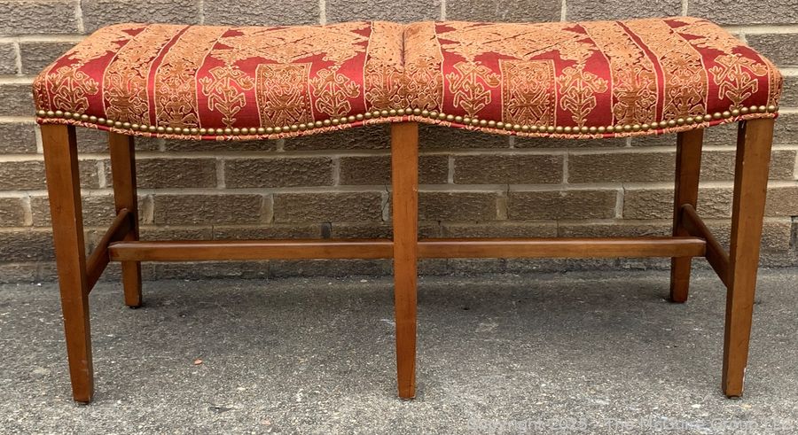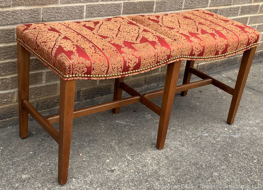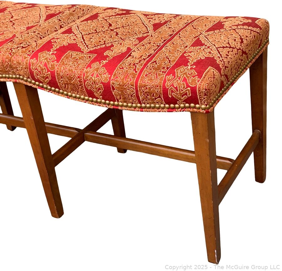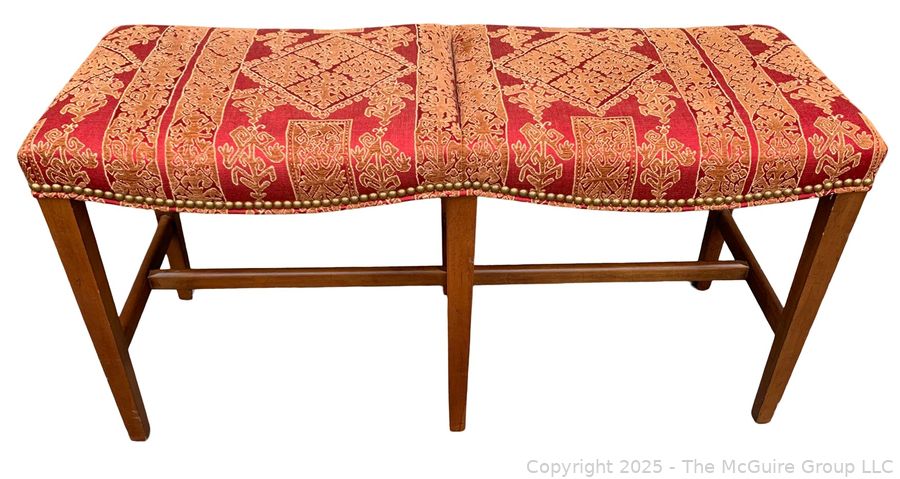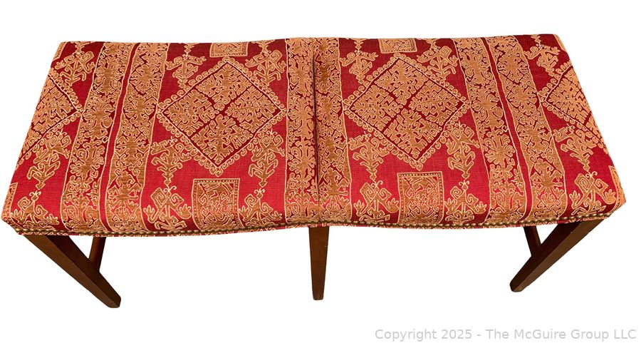 Lot #0089CS: Mahogany Double Saddle Bench in Red Chinoiserie Upholstery by Jules Rist. 39"W x 15"D x 20"H