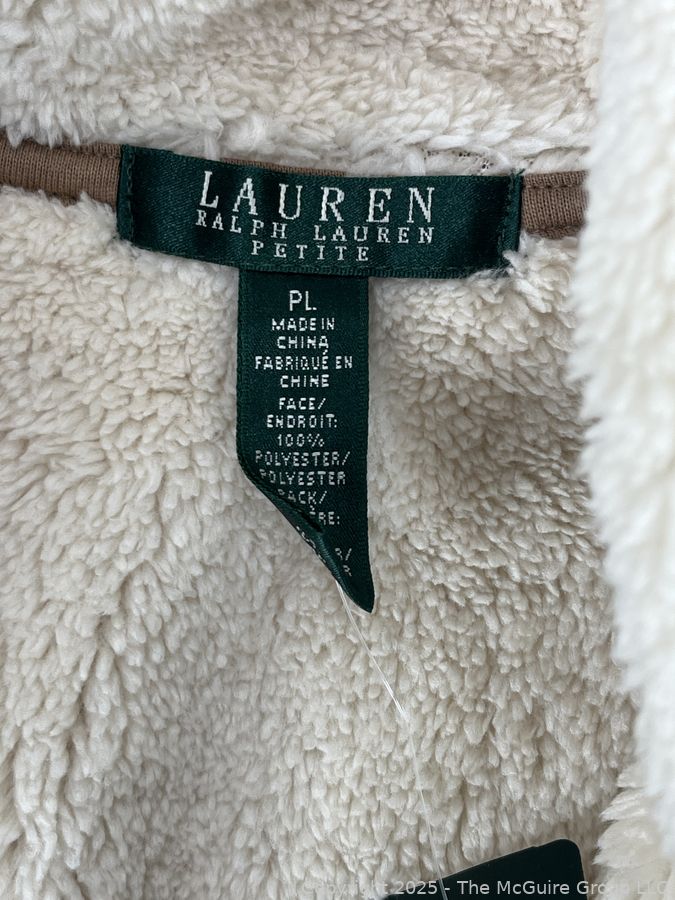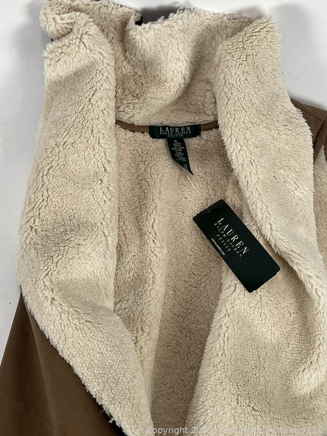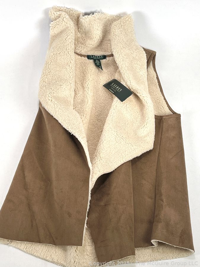 Lot #0379CP: Ralph Lauren Faux Suede Shearling Draped Vest, PL, New with Tags