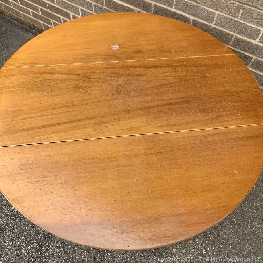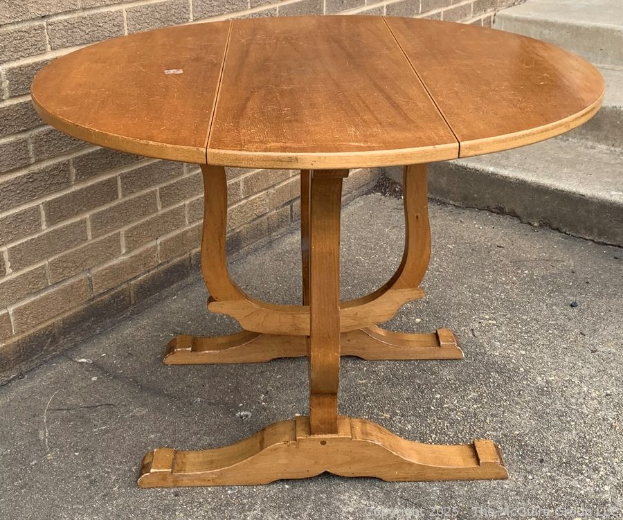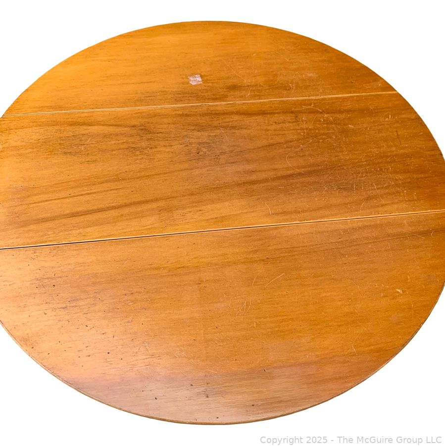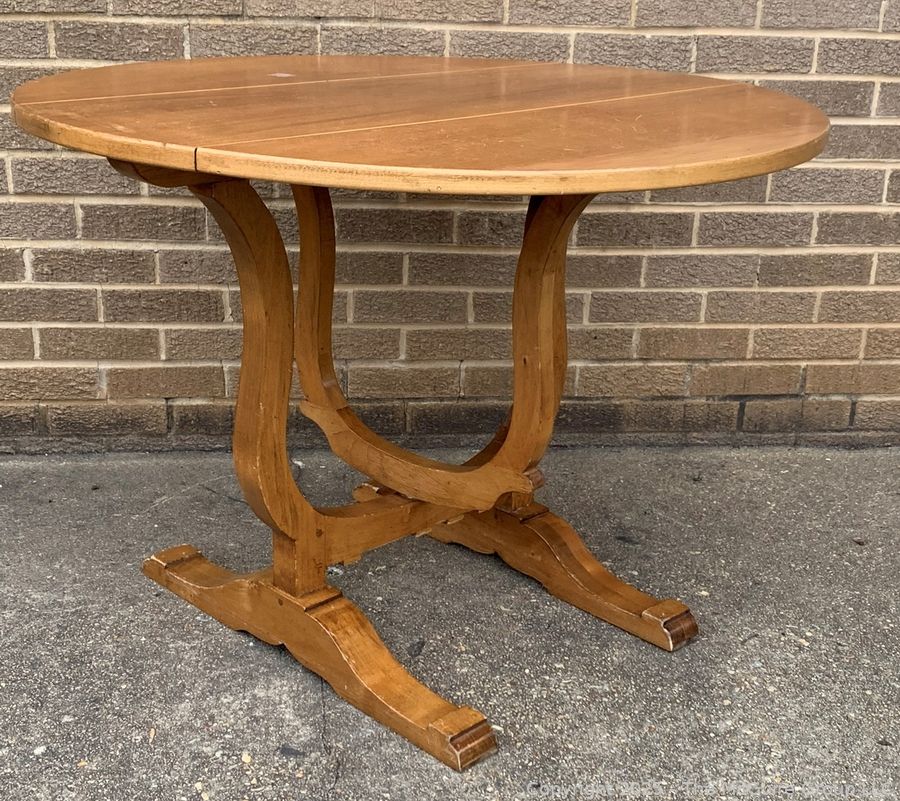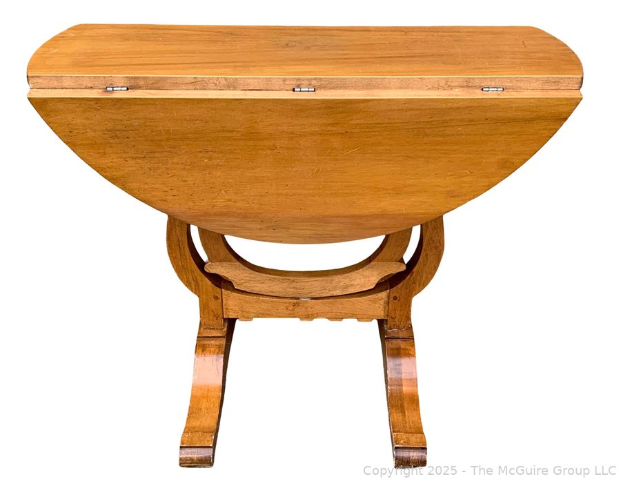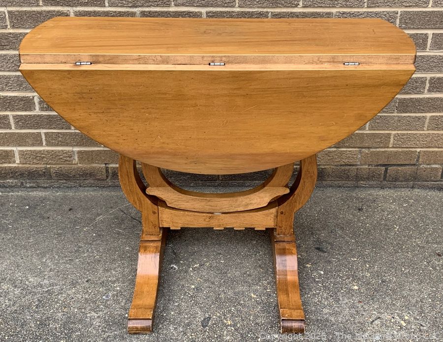Lot #0083CS: Round Drop Leaf Coaching Table with Lyre-Shaped Swivel Supports. 36" diameter