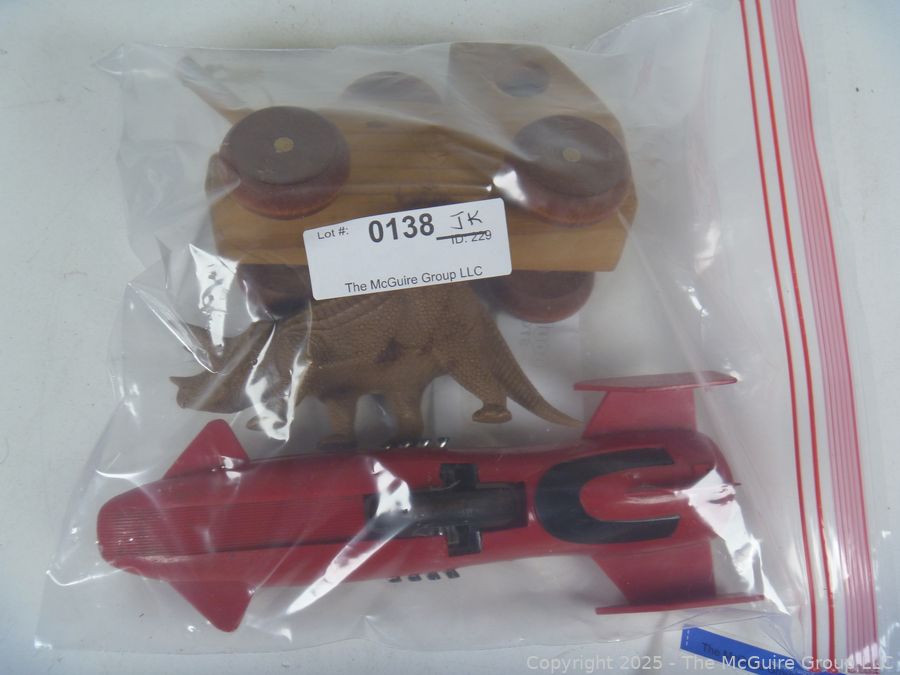 Lot #0138JK: Vintage Toys: Wooden Pull Toy, Plastic Dinosaur and Friction Racer