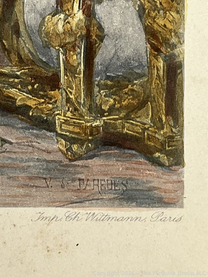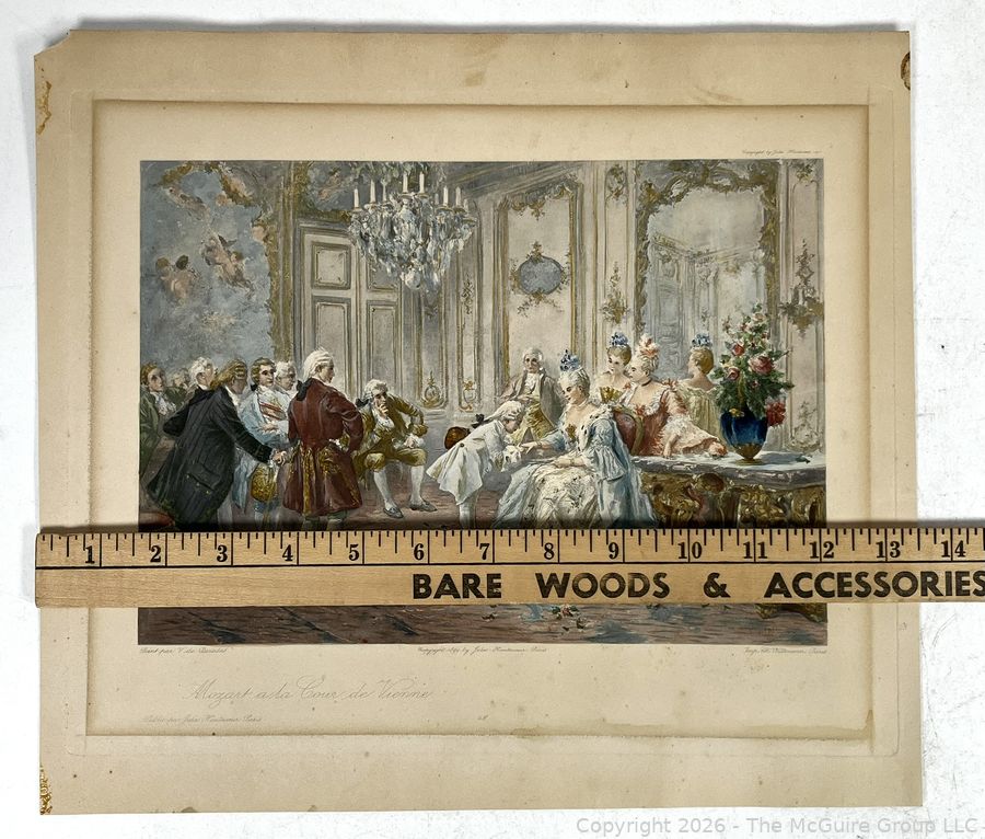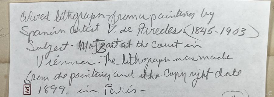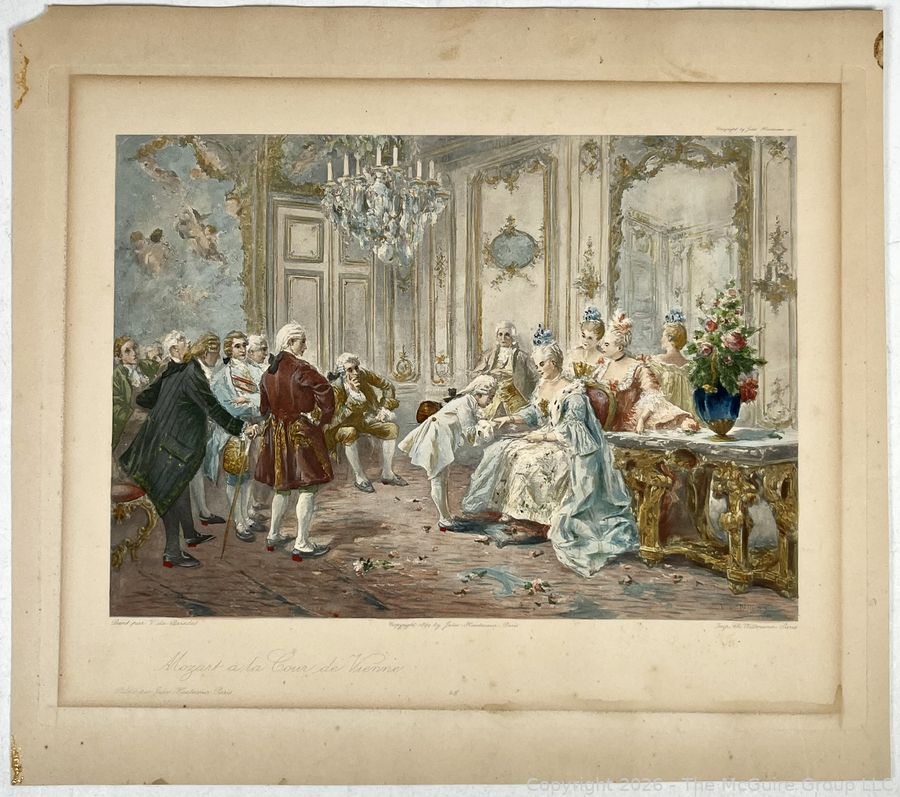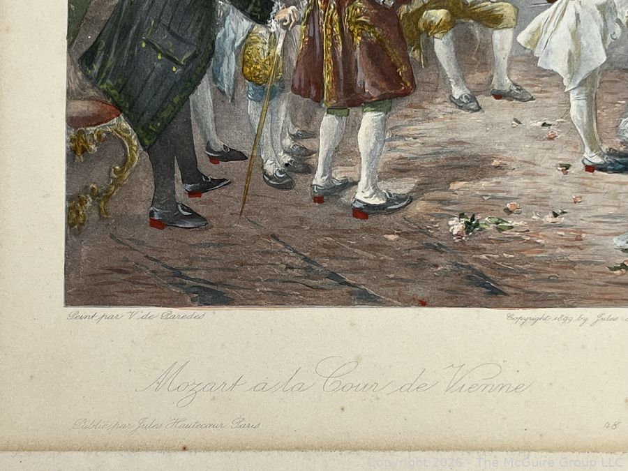 Lot #0304CS: 1899 Colored Lithograph of Mozart at the Court in Vienna. Painting by Spanish Artist V de Pareches (1845-1903)