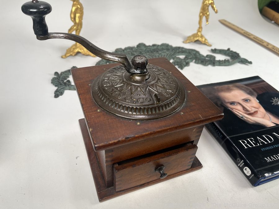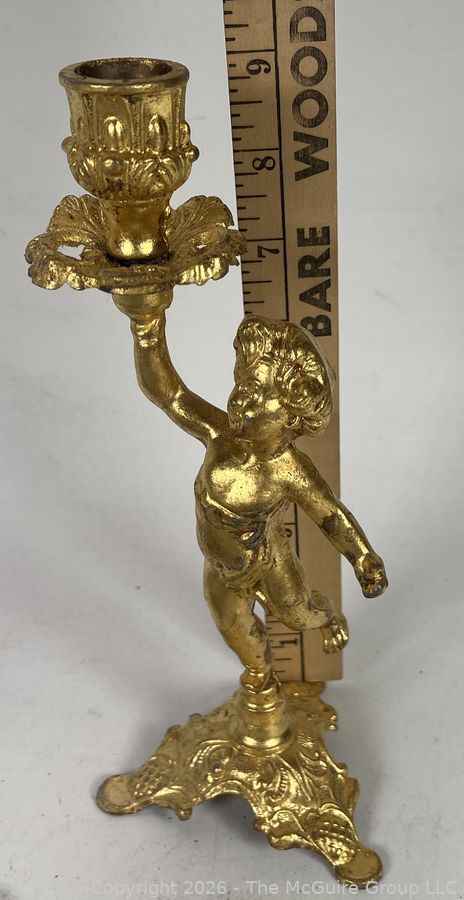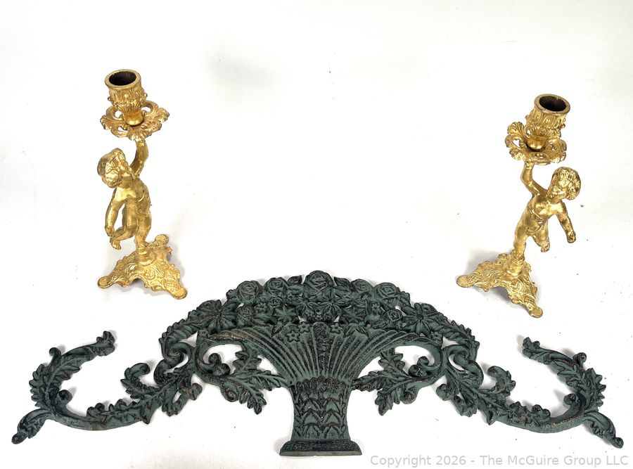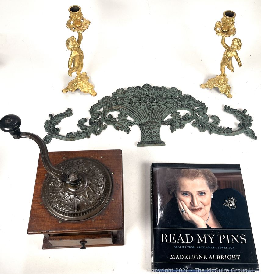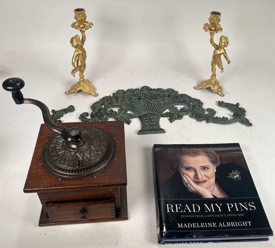 Lot #0399CP: Two (2) Louis XV Ormolu Cherub Candlesticks, Coffee Grinder, Pediment And Madeleine Albright Book