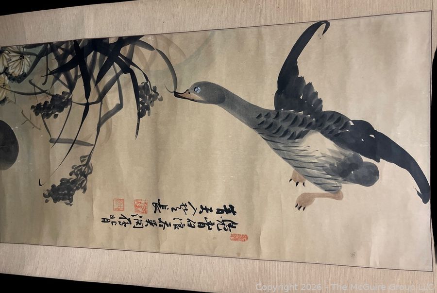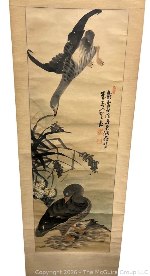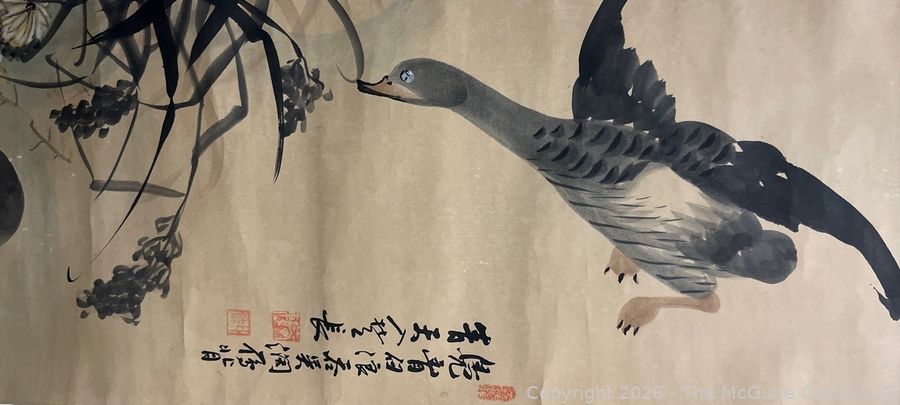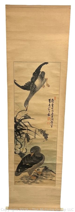 Lot #0060: Chinese Silk Scroll Painting of Mallards, 1897 Attributed to Chang Sŭng-ŏp. 15 x 97"