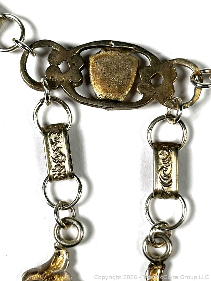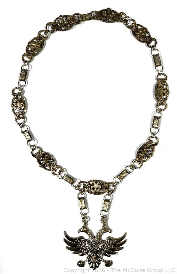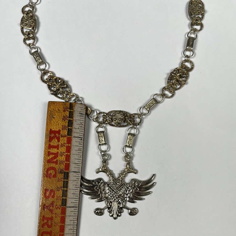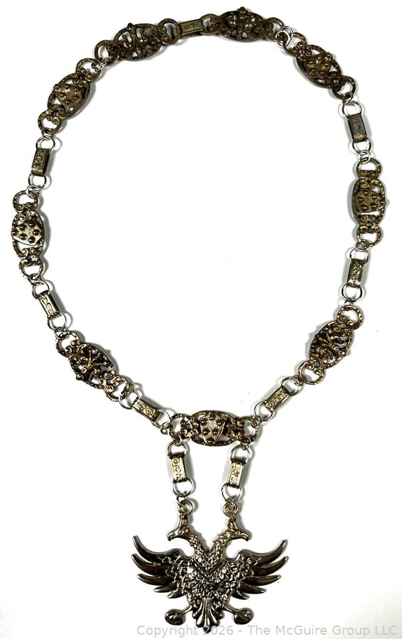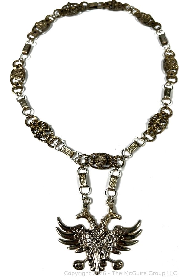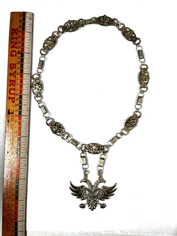 Lot #1001CS: Double Headed Eagle Pendant on Ornate Link Chain, Unmarked Sterling Silver.