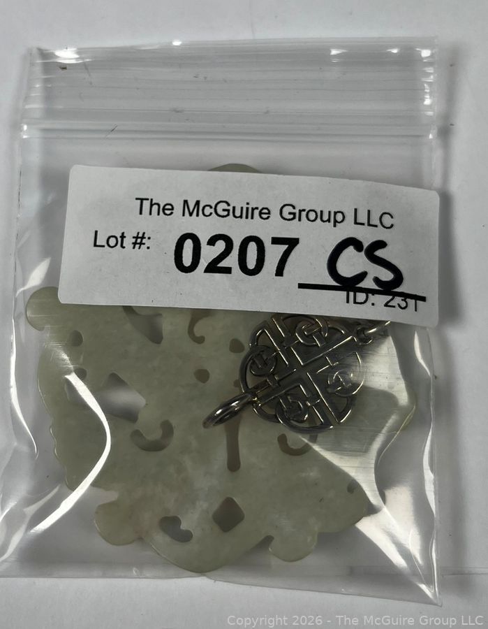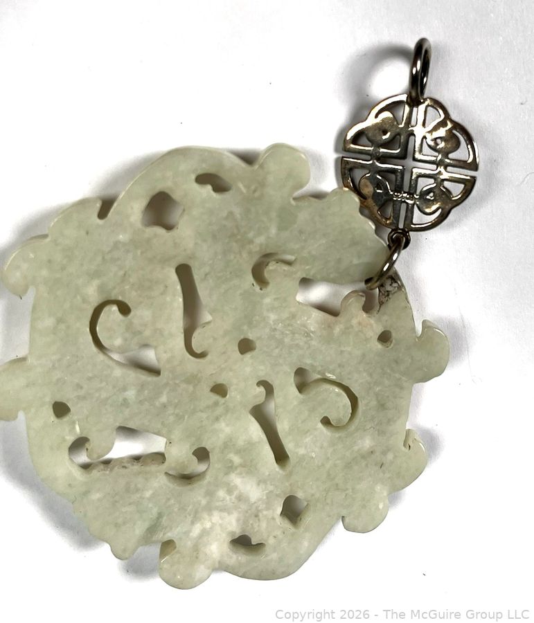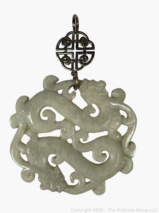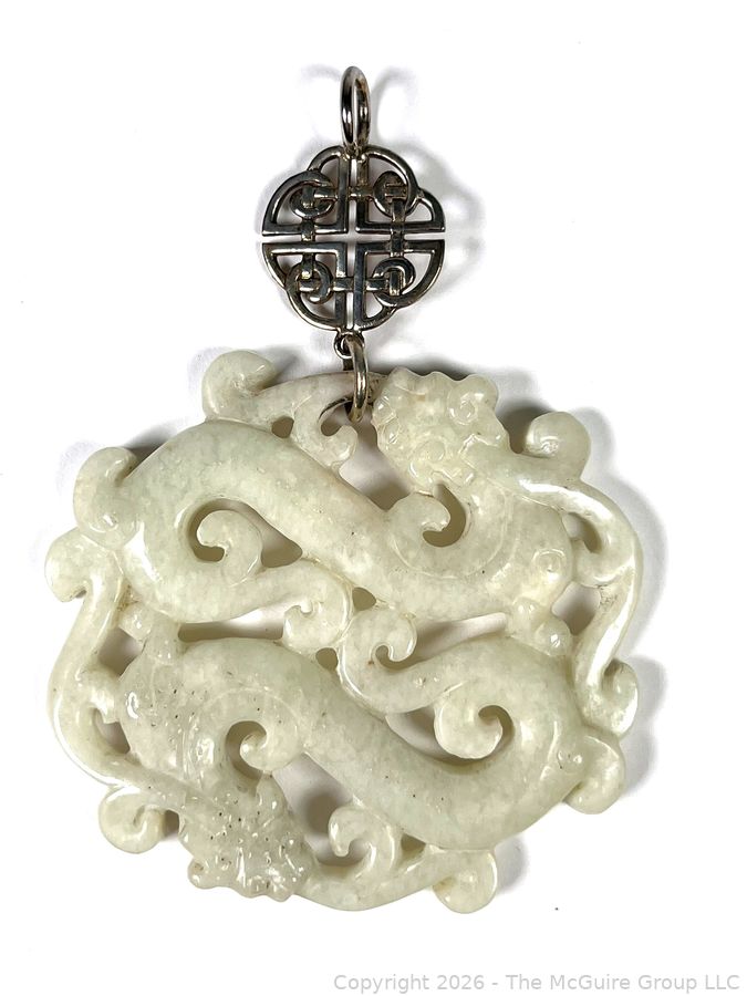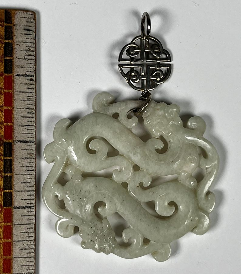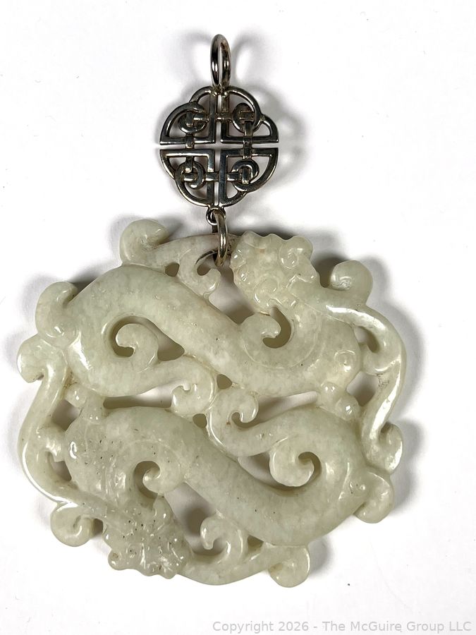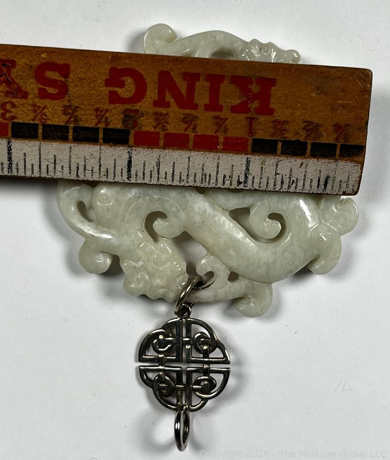 Lot #0207CS: Nephrite Jade with Sterling Drop Carved Dancing Dragons Pendant.